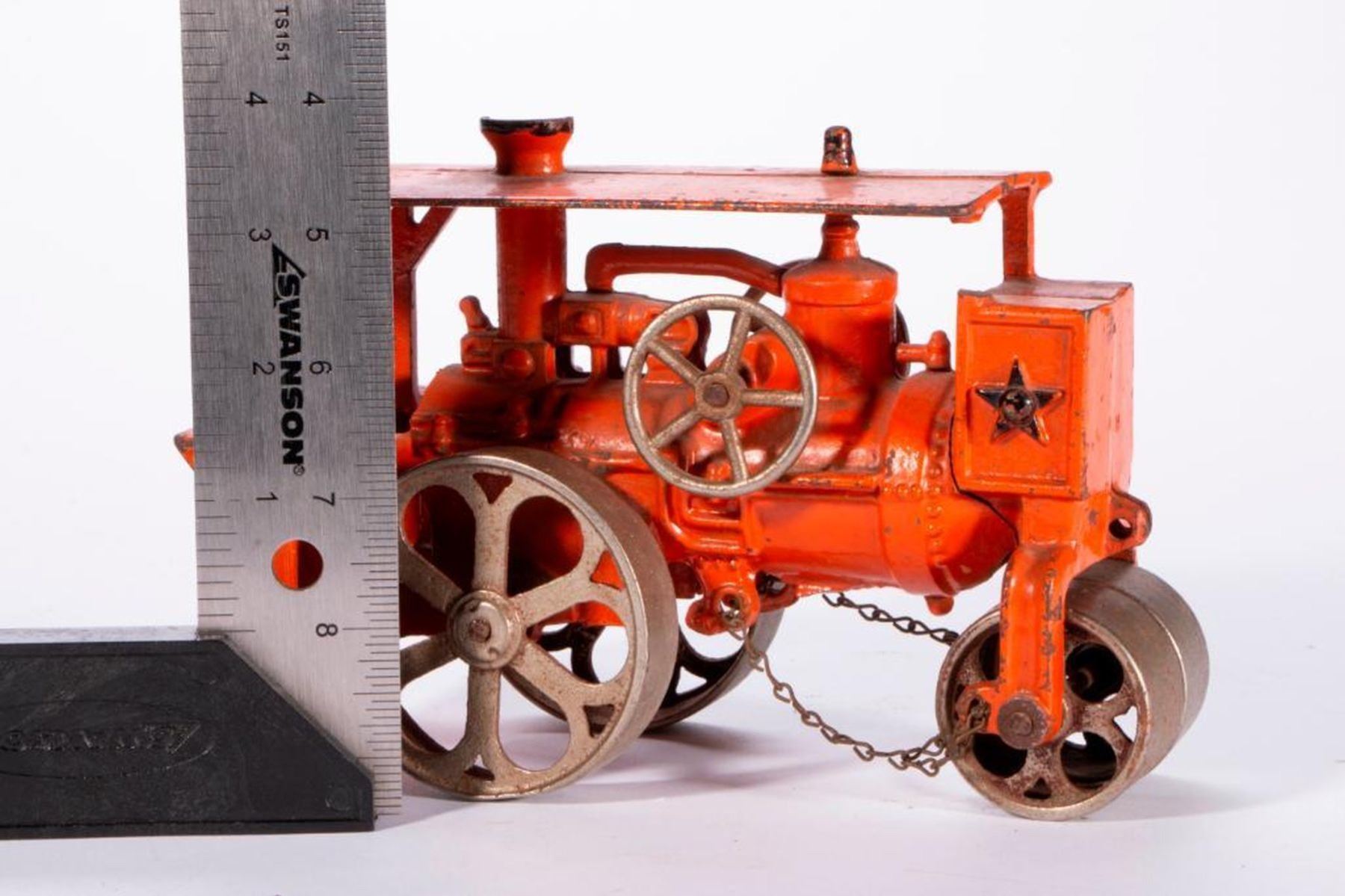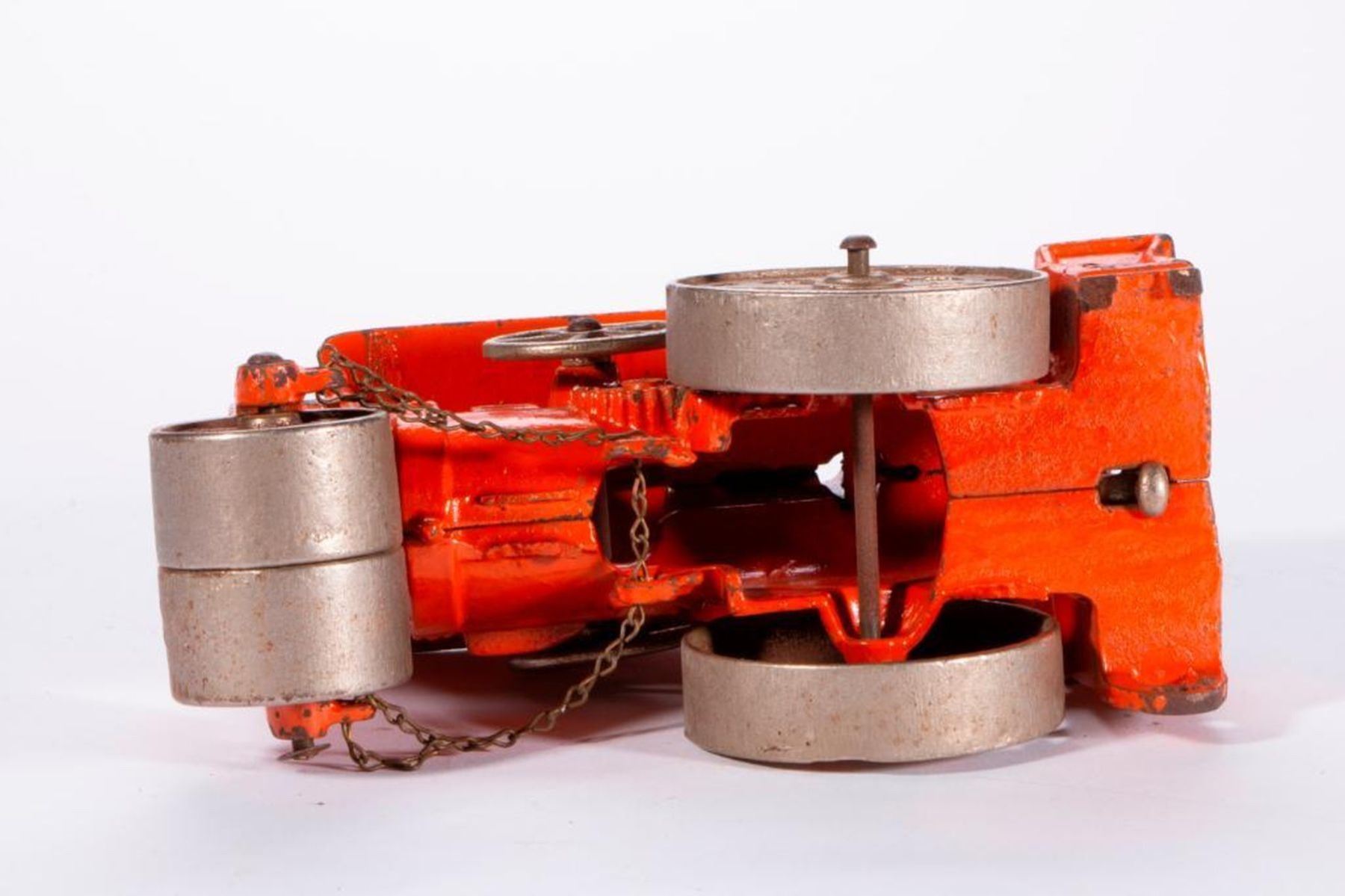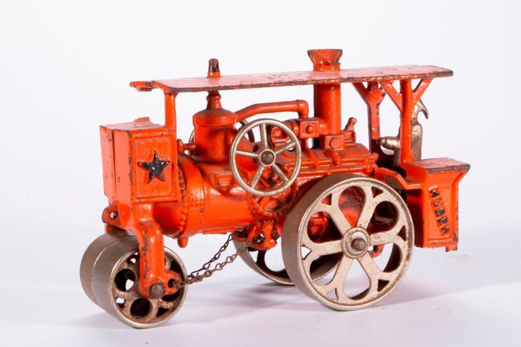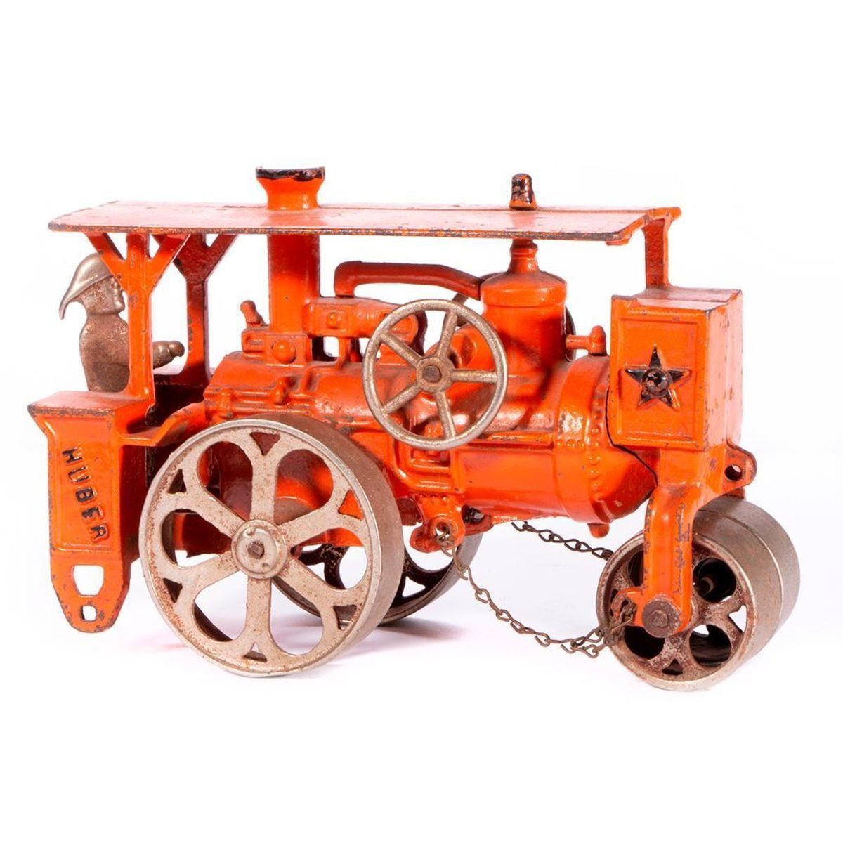 An early 20th century model steam roller marked Huber measuring 5 inches high x 8 x 3 1/2. Chip to stack. Items are sold as is. Please inquire about condition if not otherwise stated.