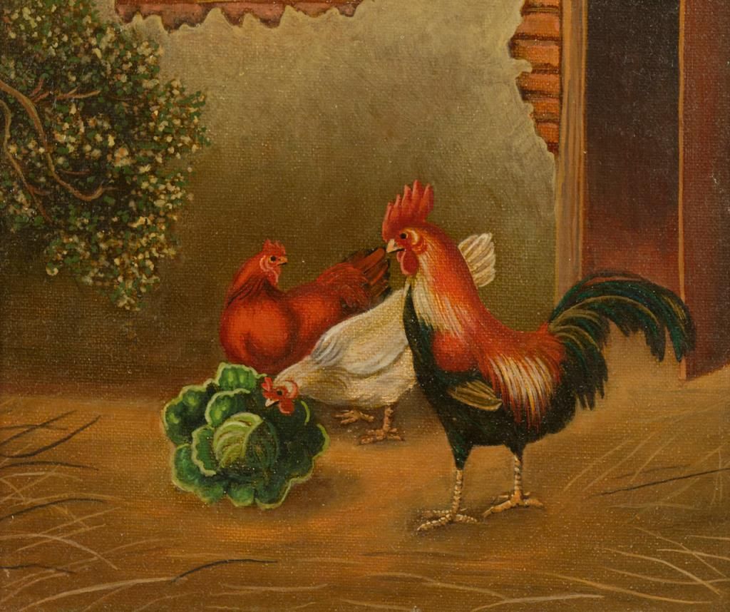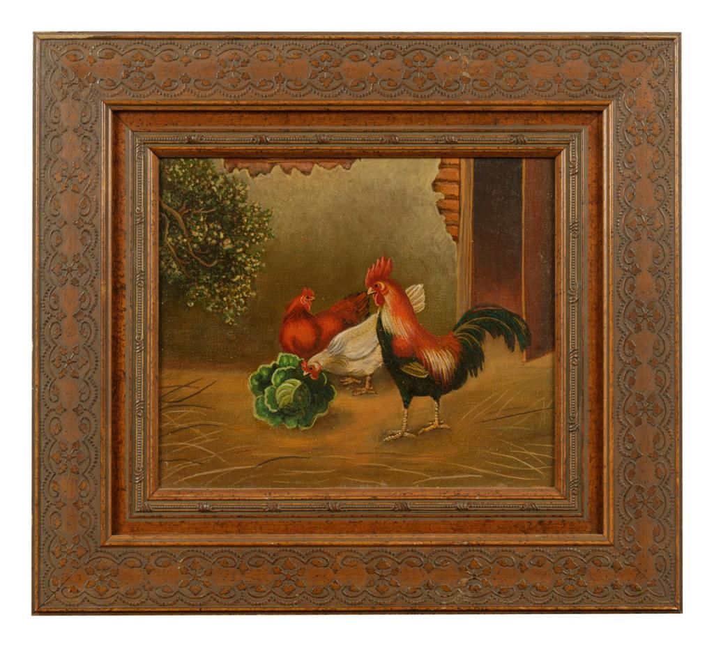 Vintage oil on canvas of rooster and hens circa about turn of the century. Framed by Omars Newport Beach for Corona Del Mar estate. Measures approximately 9”x10”. The frame is over $300 more than 30 years ago. Est.: $150-$300