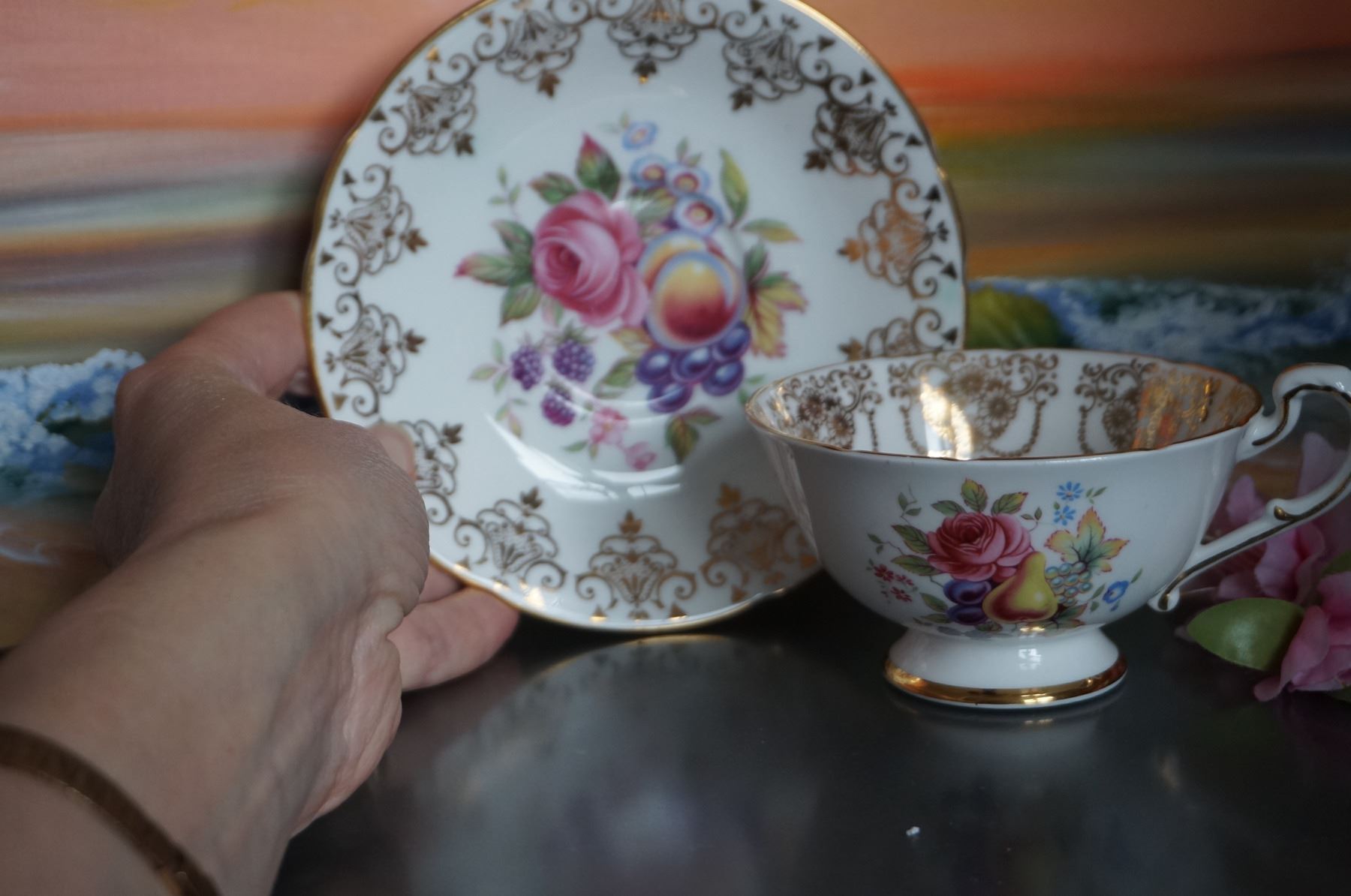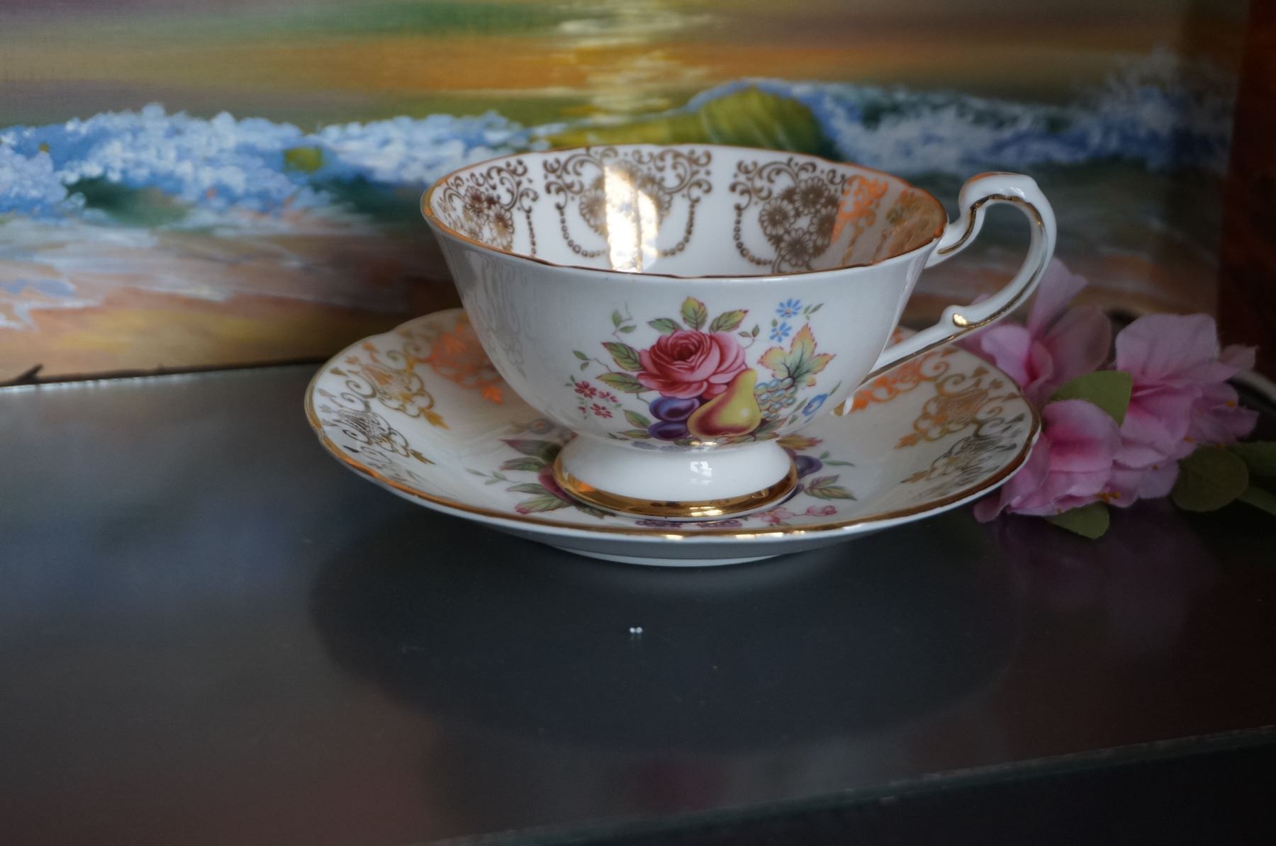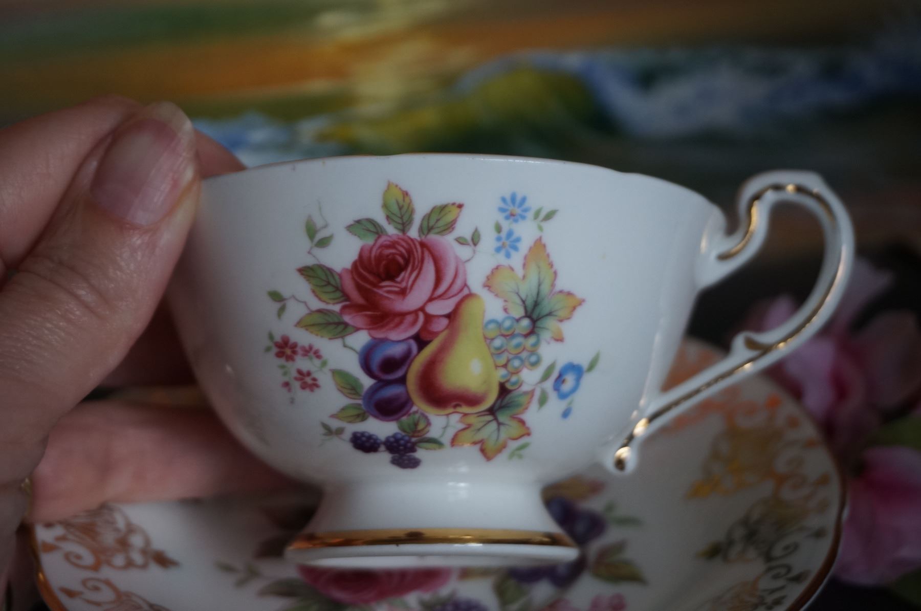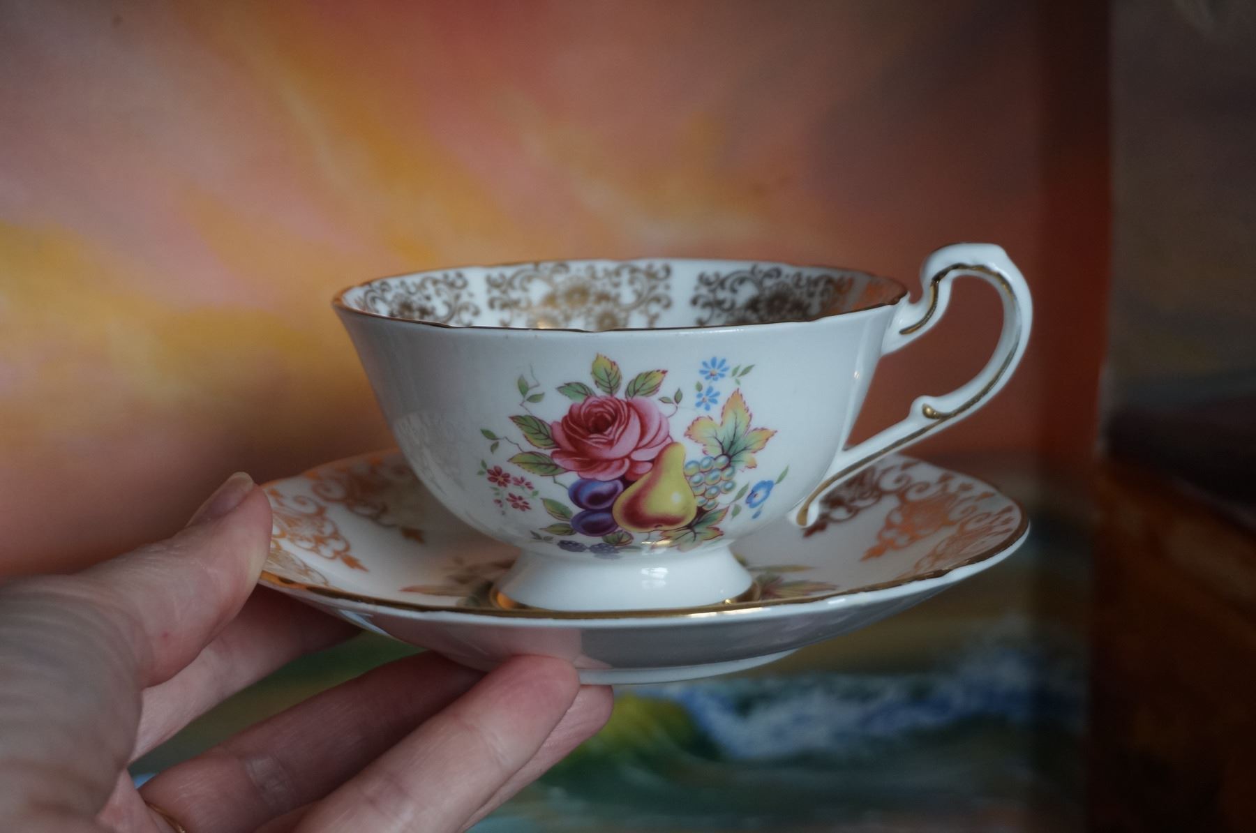 tea cup with pear and saucer with apricot.