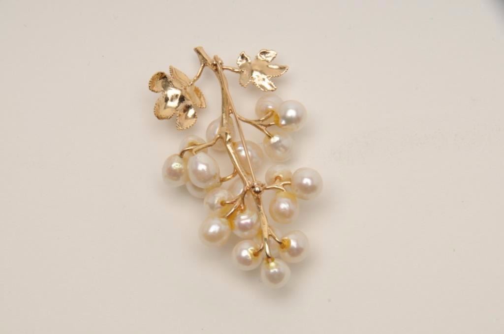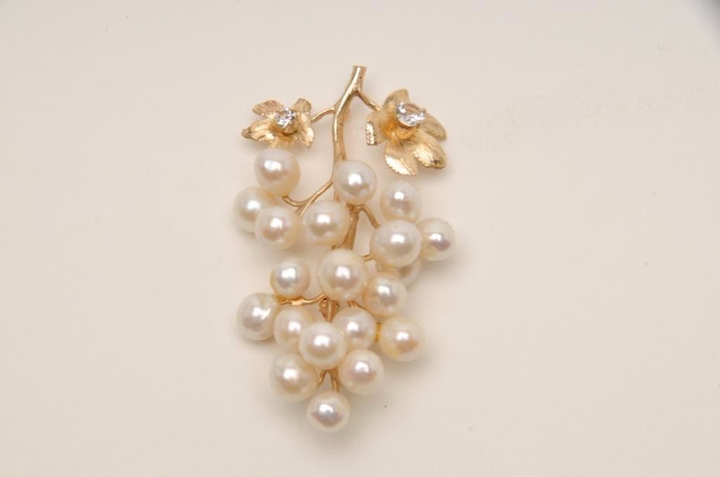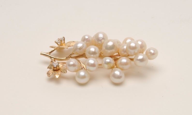 Vintage pearl broach in 14K with two fine diamonds circa 1950’s. Superb pearls possibly natural. Est.; $300-$600