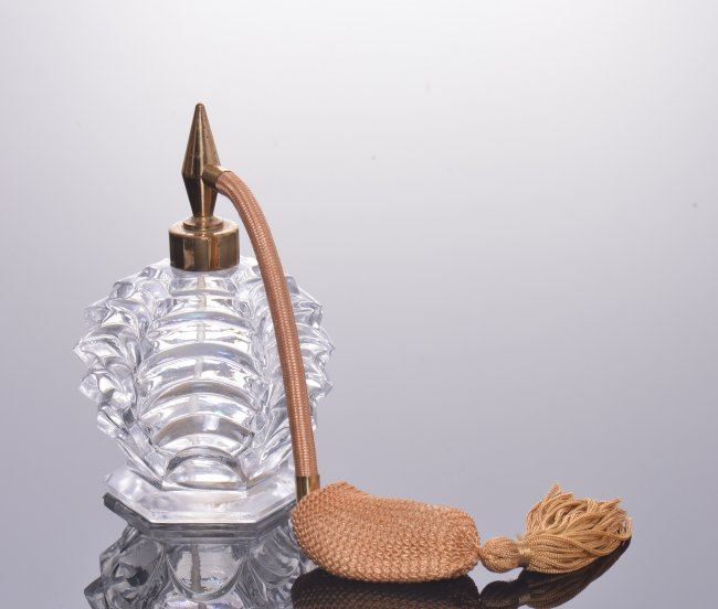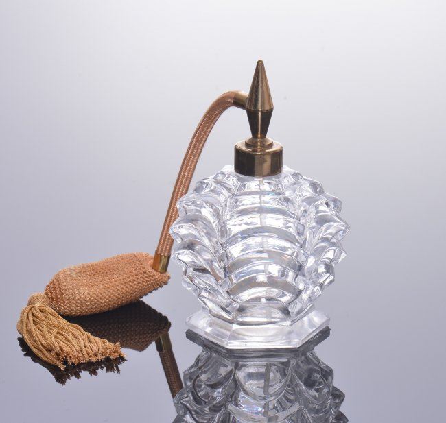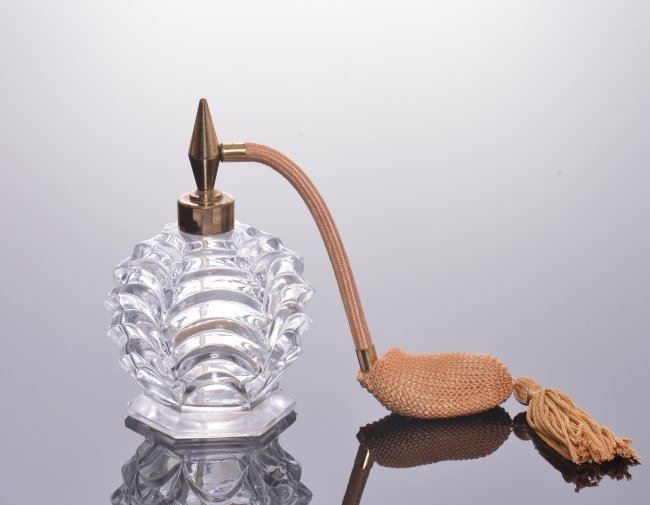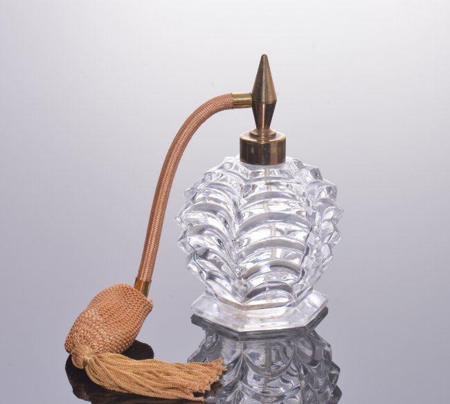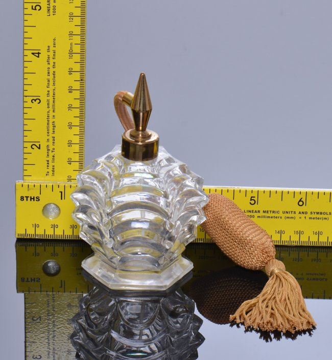 Vintage perfume bottle with tassel pump. SIZE: see attached ruler photo. Photos are part of the description representing the condition report and can be used for authentication prior to the sale date. Pangaea Auctions urges Bidder's to view all attached photos in detail.