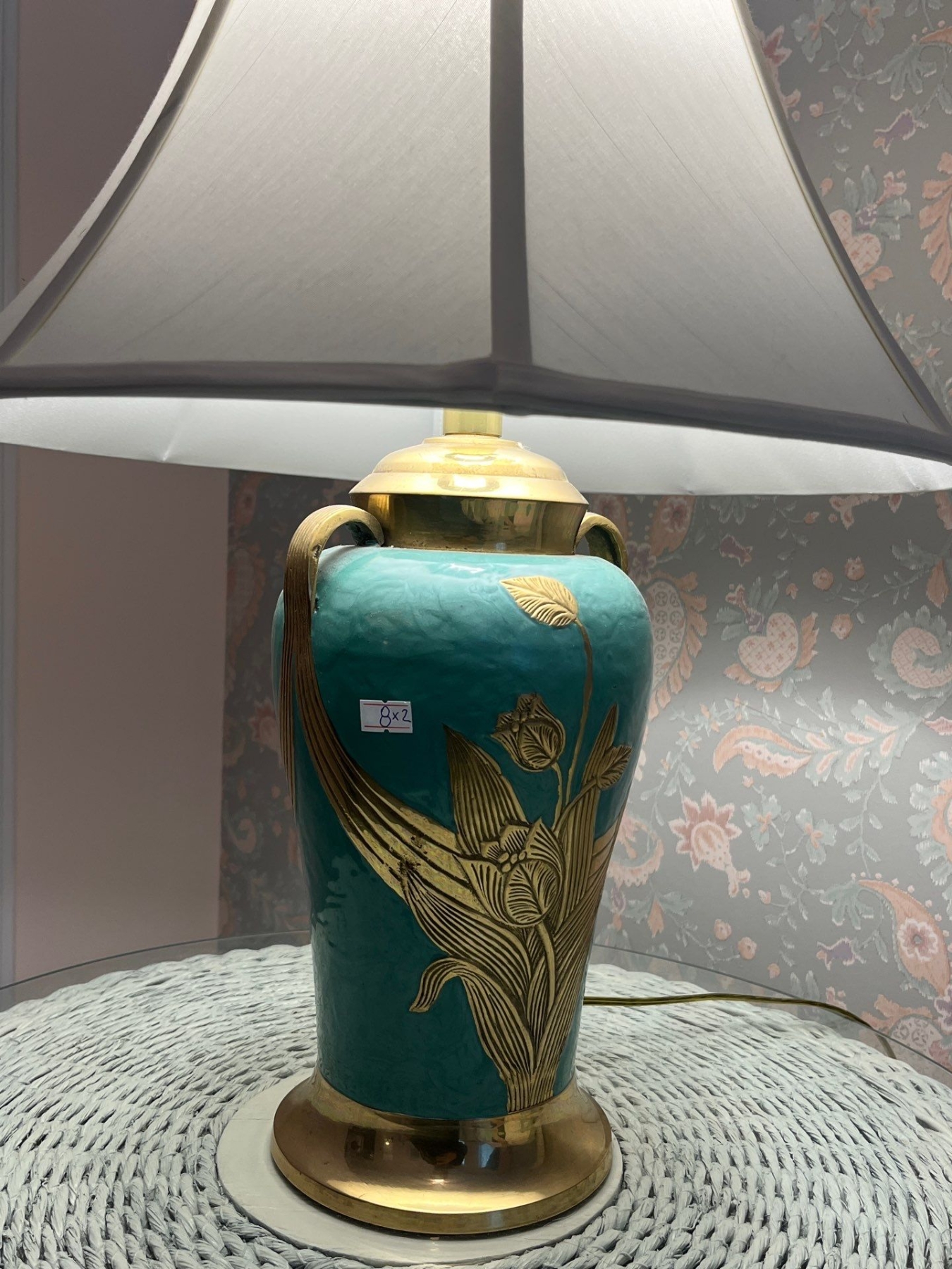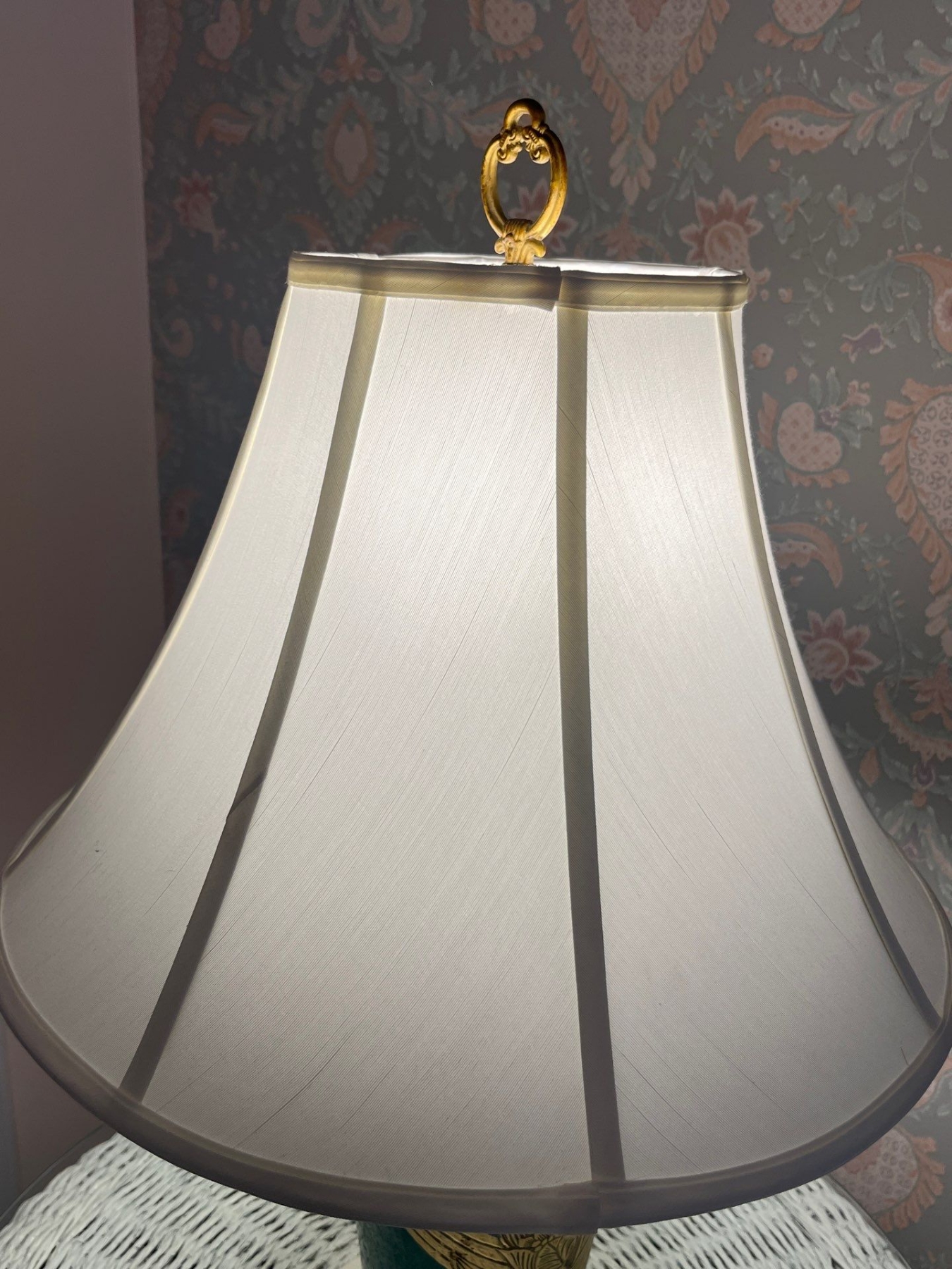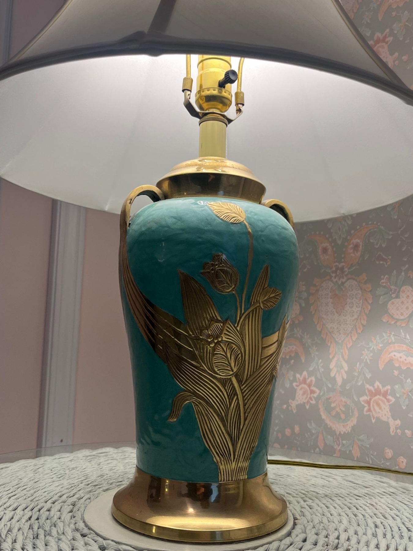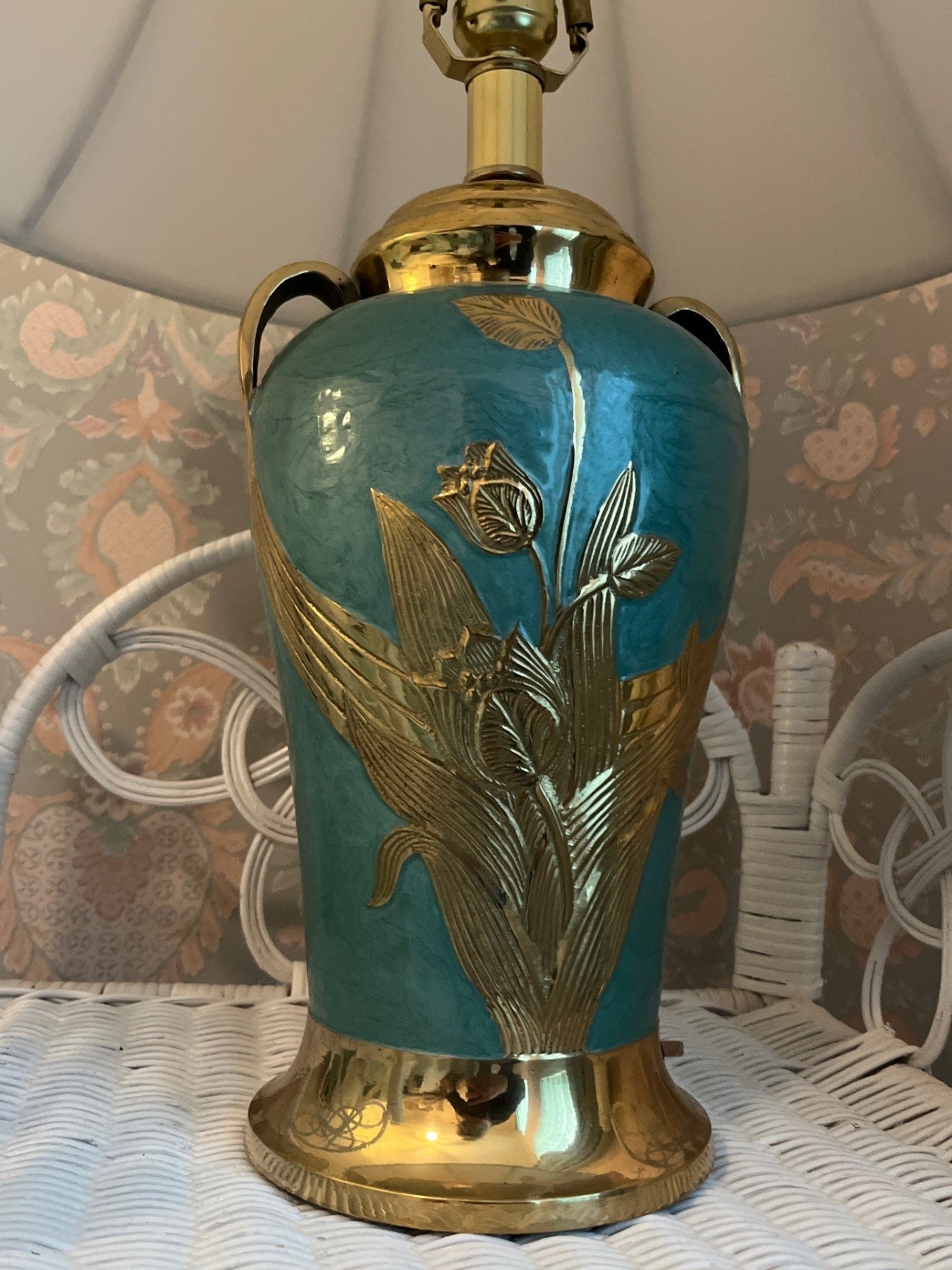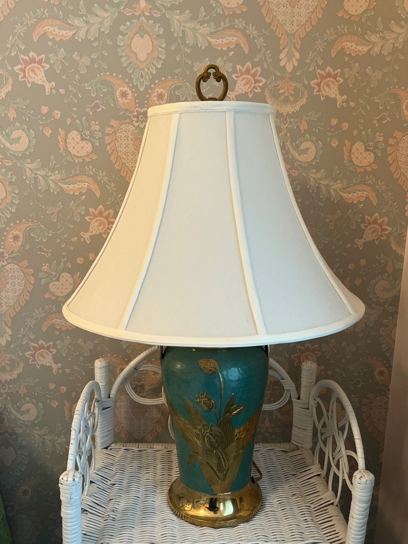 Vintage porcelain table lamp in a robin egg blue color with brass hardware. Soft white shades .