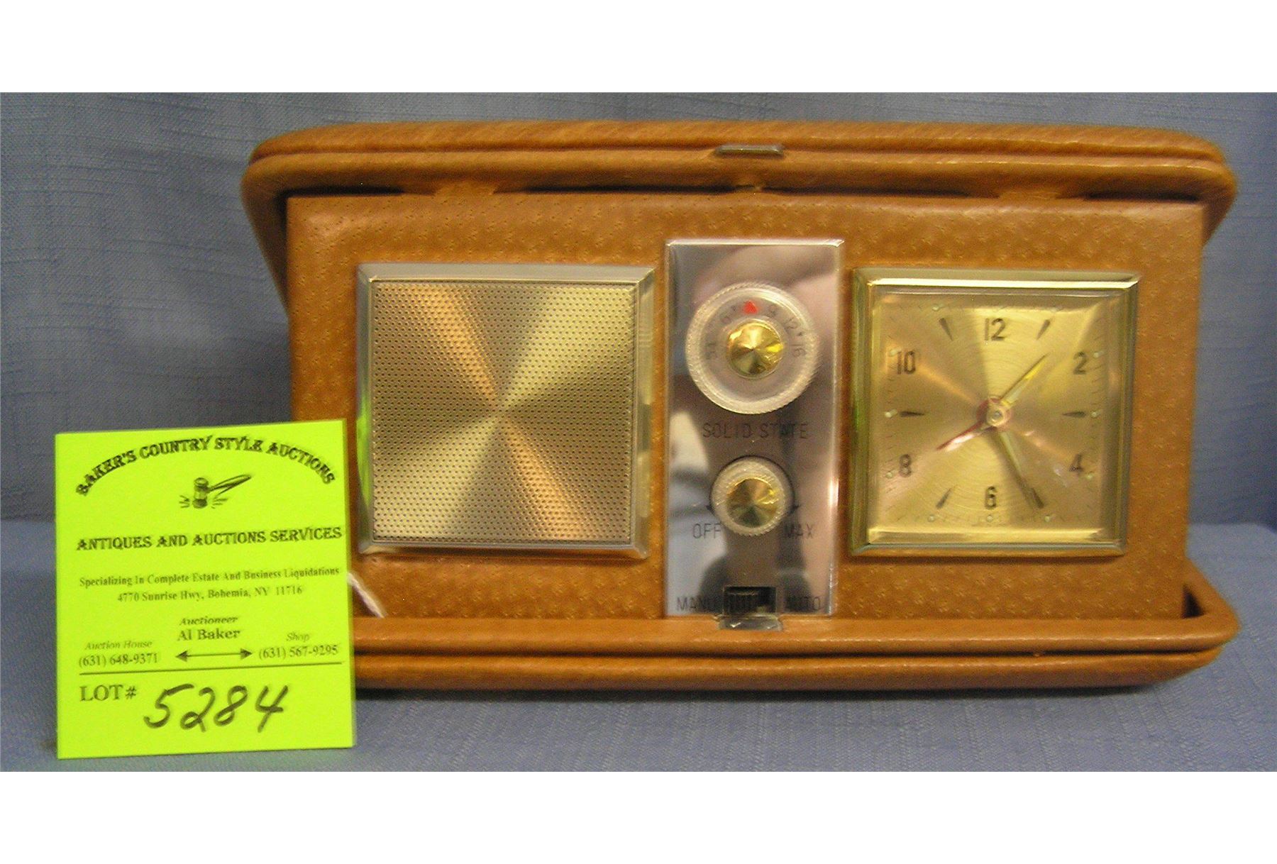Vintage portable radio and alarm clock in leather case circa 1960?s scarce est. value $125.00-$150.00
