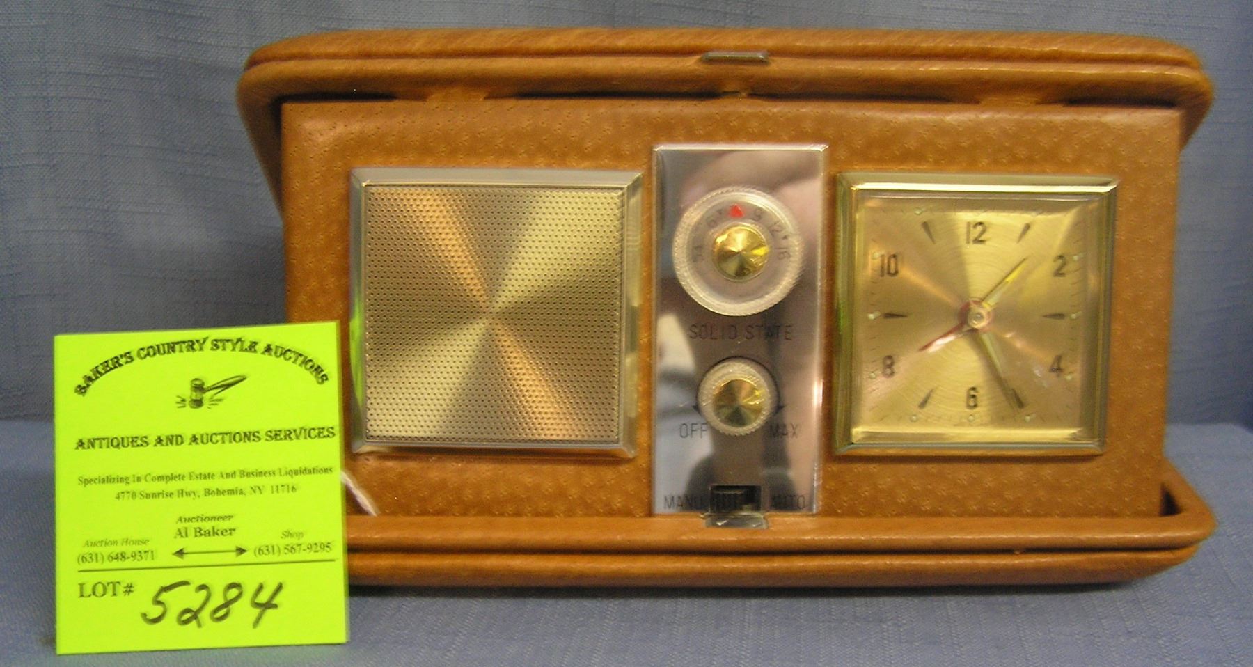Vintage portable radio and alarm clock in leather case circa 1960’s scarce est. value $125.00-$150.00