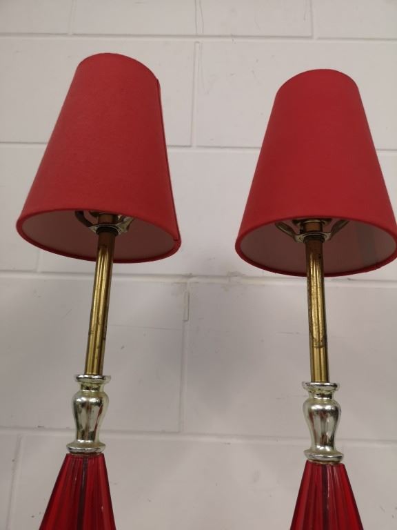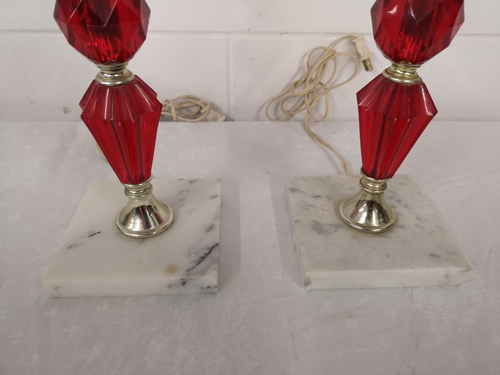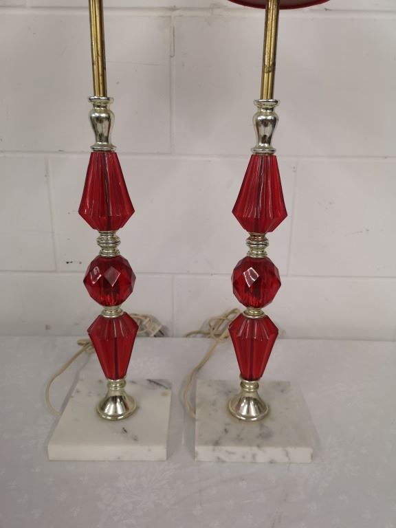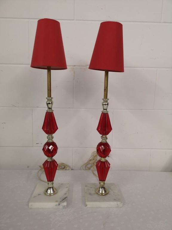 These vintage lamps come to you in good pre-owned condition with some scuffs and scrapes on the metal frame and some chips and marks presents on the marble style bases. They are tested and working (light bulbs included). They are approximately 24.25 in tall and the shades have a 4.5 in diameter and are 5.75 in tall.