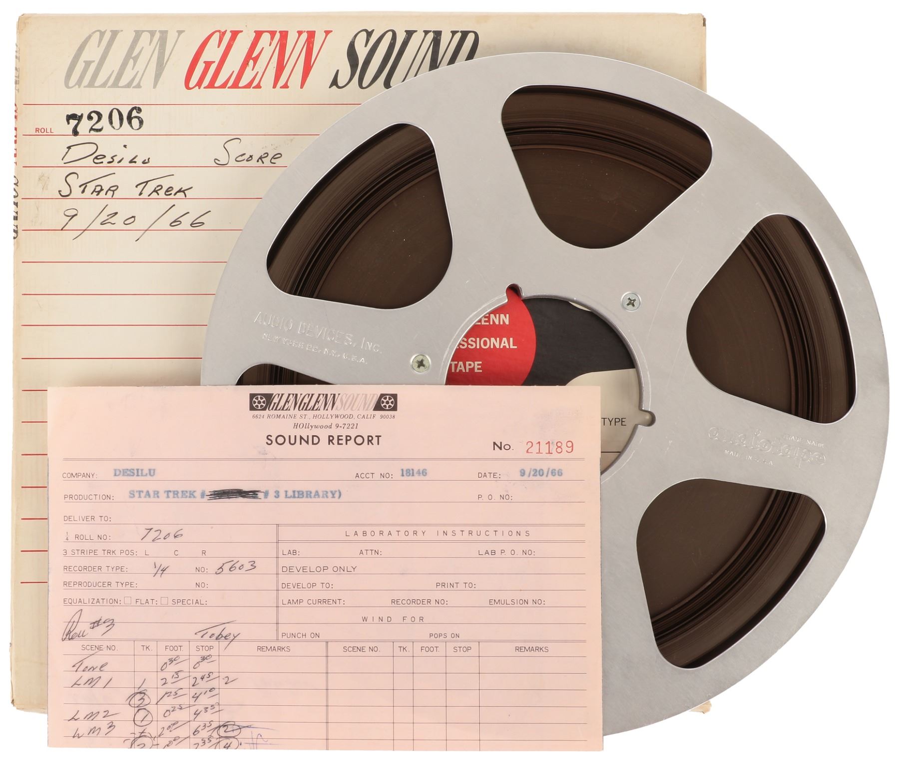 368. Vintage reel-to-reel tape labeled "Desilu Score Star Trek 9/20/66" with original sound report from Glen Glenn Sound. (1966) Vintage original magnetic audio tape reel for reel to reel tape player. The reel measures 10.5 in. diamter and contains a full spool of 1/4 in. tape. The Glen Glenn Sound box is handwritten, "Desilu Score, Star Trek, 9/20/66". Accompanied by a printed round report/receipt typed, Desilu, ACCT No. 1846, 9/20/66. Star Trek #3 Library" with other production information. Box exhibits damaged edges. Tape appears fresh and stable. Unplayed by Profiles. In vintage very good to fine condition. $400 - $600