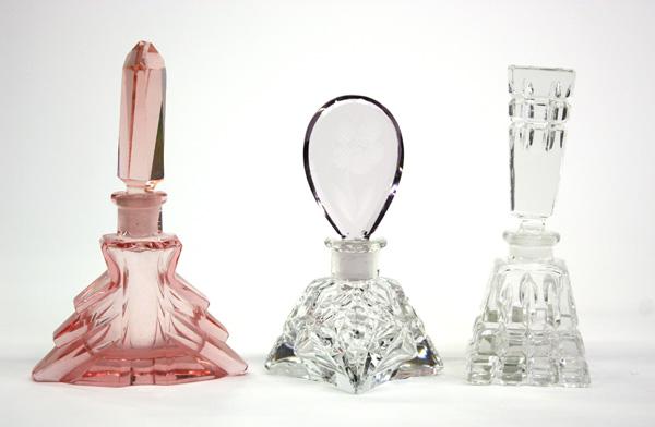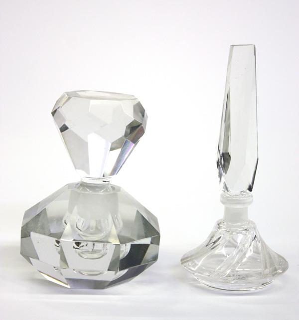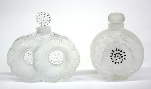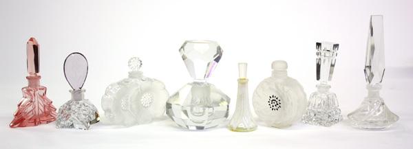 (lot of 8) Vintage scent bottles, including a Lili ''Easter Lily'' in original box, Lalique ''deux fleurs'', tallest: 6''