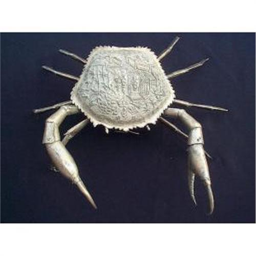 Early 20th. century silver art in shape of a large crab. The legs and claws are articulated and move independently. The body is in shape of a box that opens and could be used as concealed jewelry box. The top (lid) of the box has an incised, chiseled and hammered figural design of 3 persons in a pavilion garden. Beautiful patina highlights the intricate design. Dimensions: 14 x 12 inches. The box measures 5.5 x 4.5 inches with a depth of 2 inches. Intact and choice rare silver item. Estimated value: $3000.