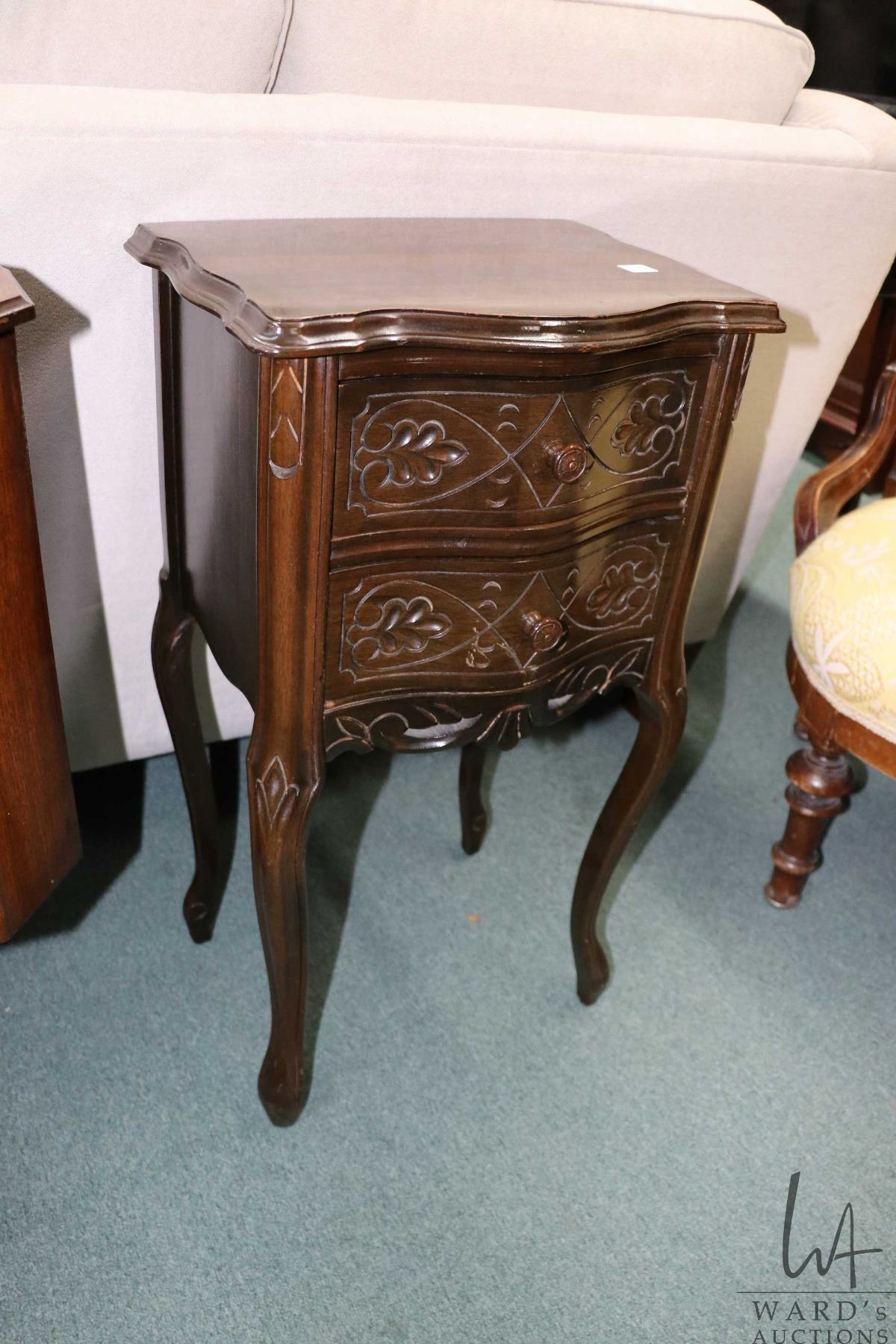 Vintage small decoratively carved two drawer side table, 28" X 15" X 12"