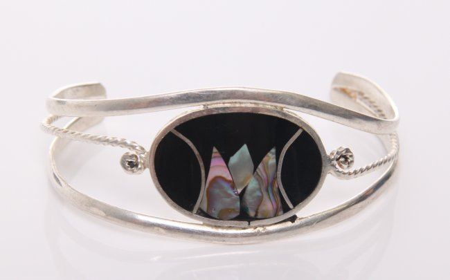 Vintage sterling silver bangle with inlaid abalone shell. SIZE: see attached ruler photo. Photos are part of the description representing the condition report and can be used for authentication prior to the sale date. Pangaea Auctions urges Bidder's to view all attached photos in detail.