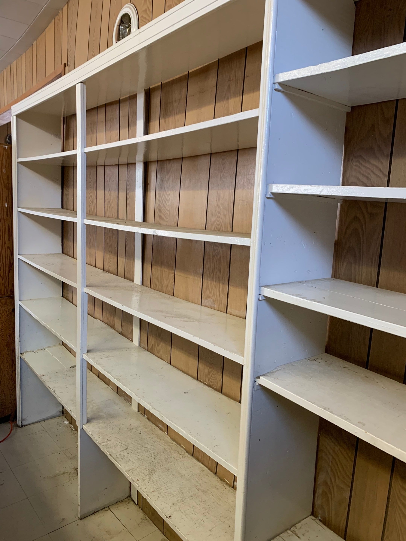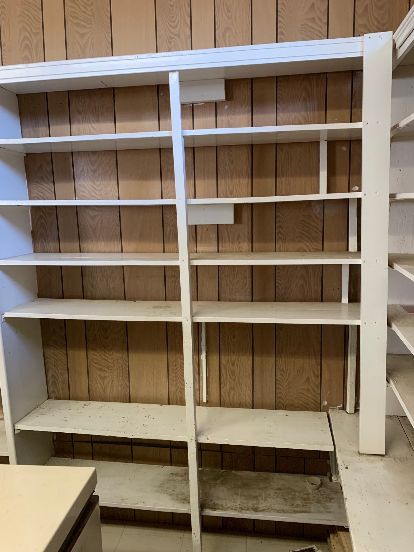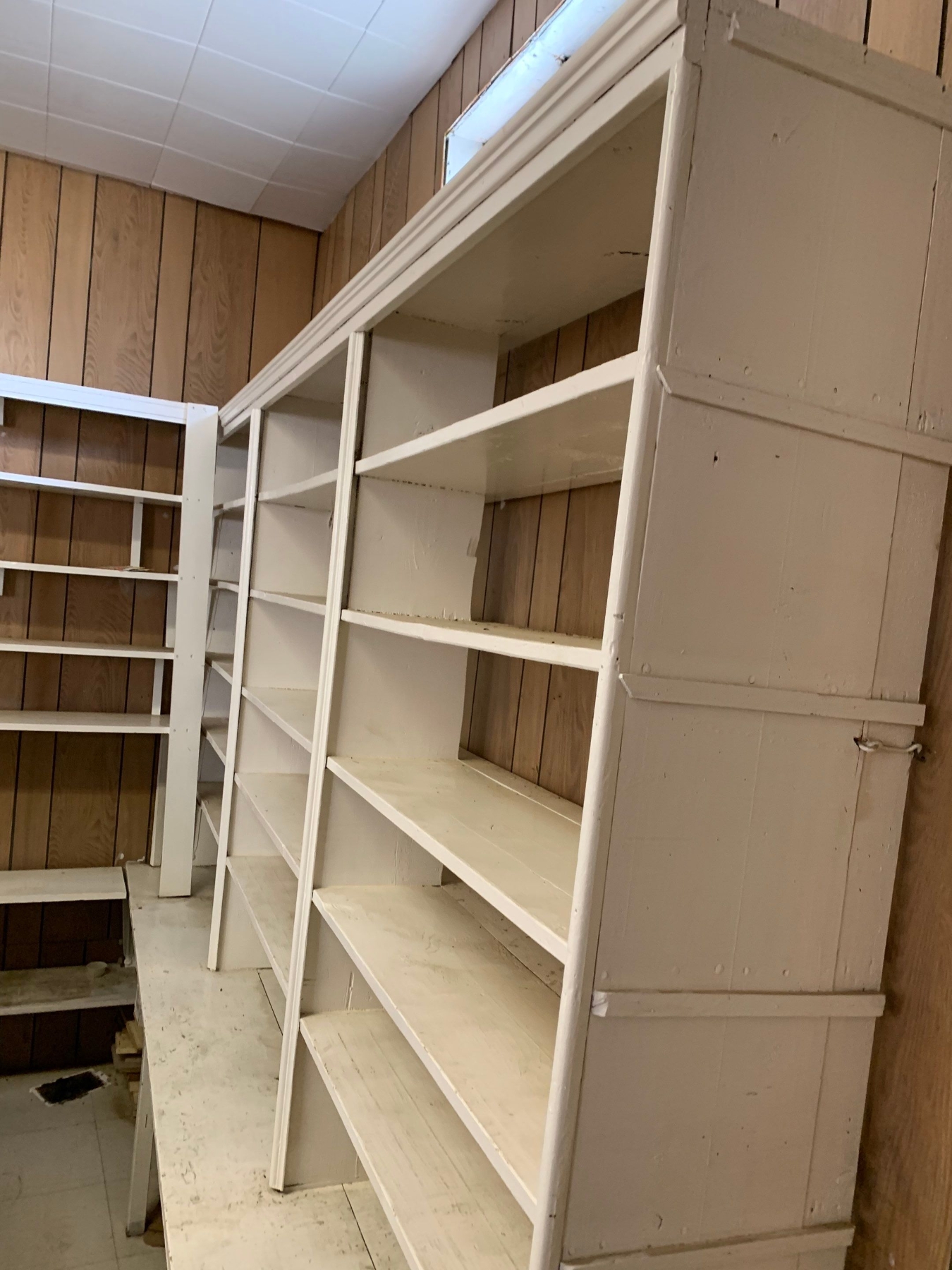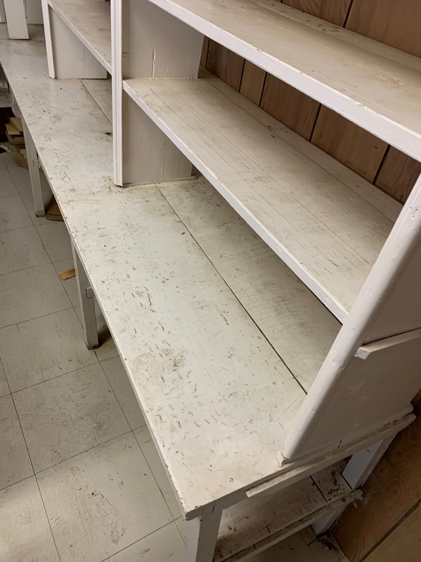 Vintage store display shelving unit, buyer responsible for disassembly and moving. Two sections, first one measures 106” L, 18”W, 90”T, second section 154”L, 11”W, 90”T