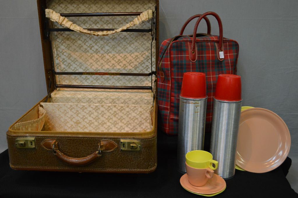 Vintage suitcase and a Thermos brand picnic including two thermos', two plates and two tea cups and saucers