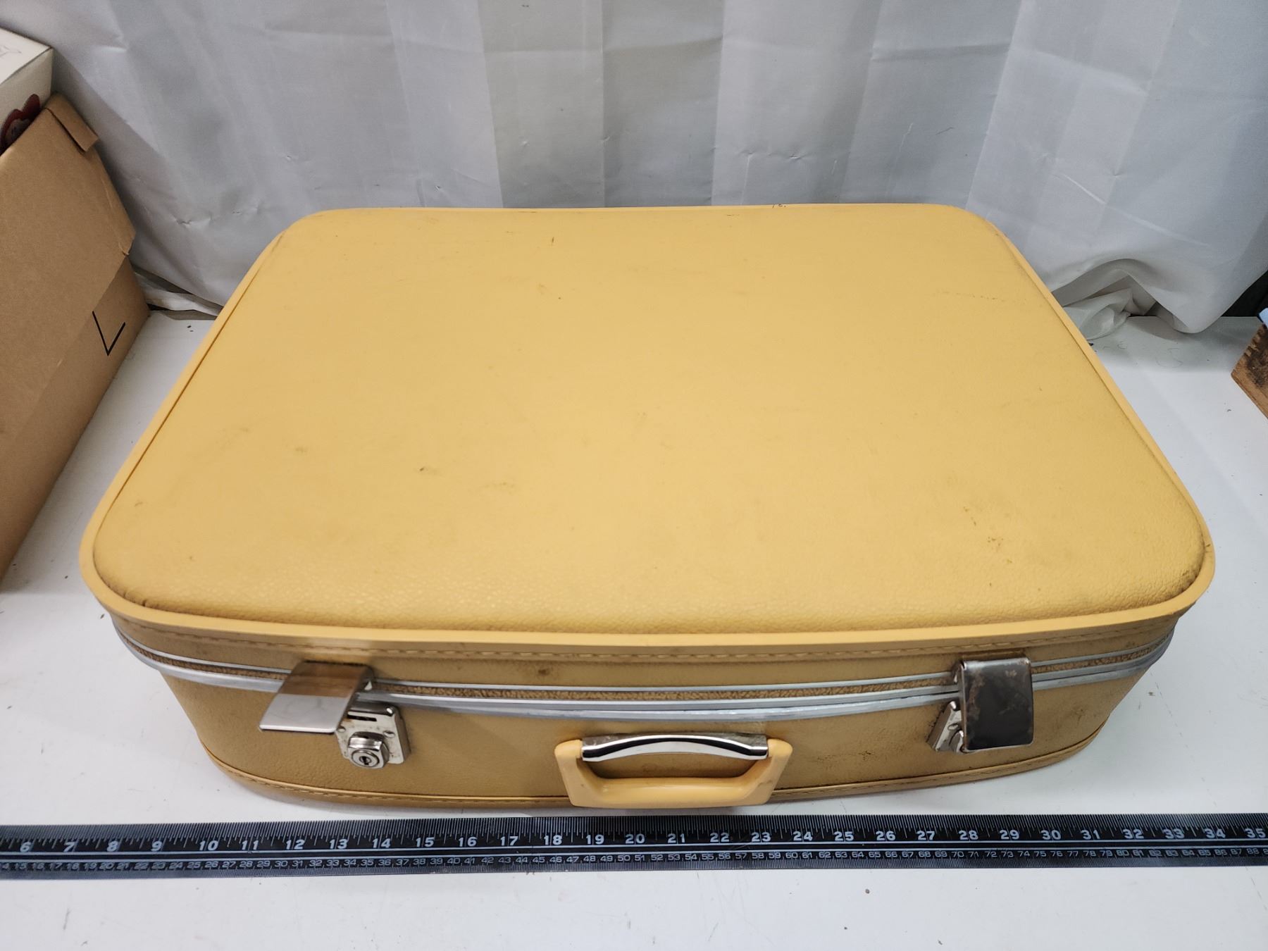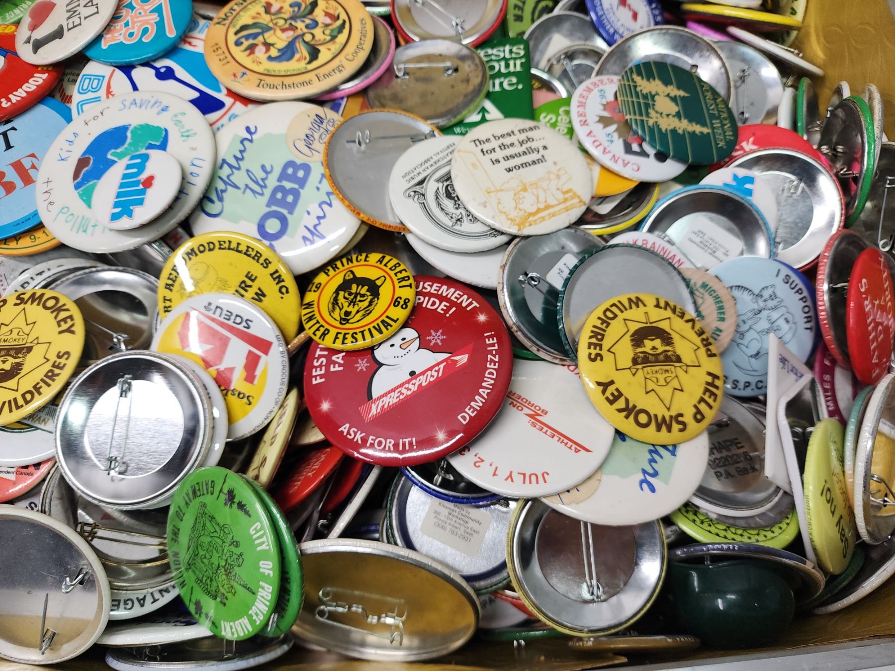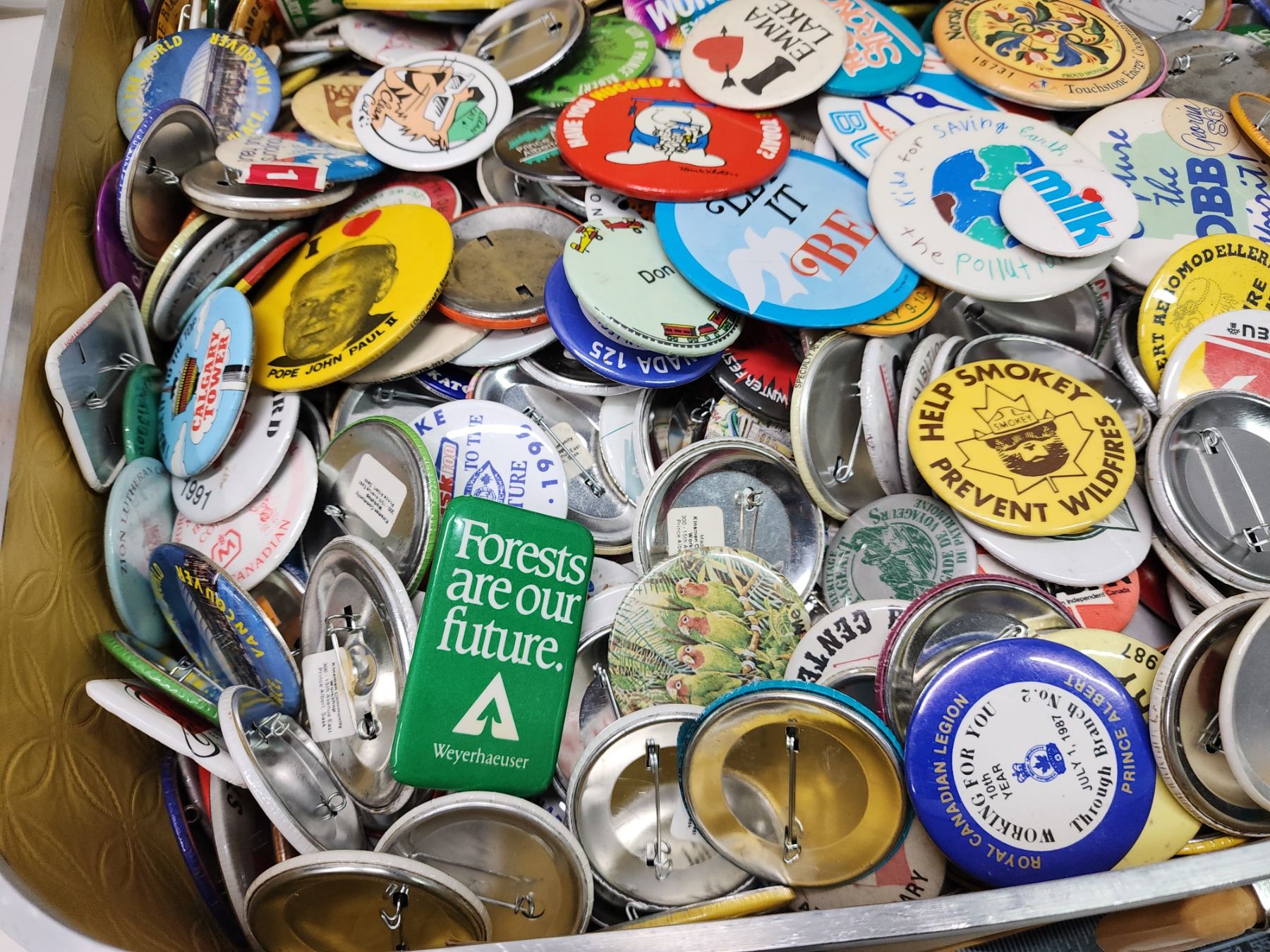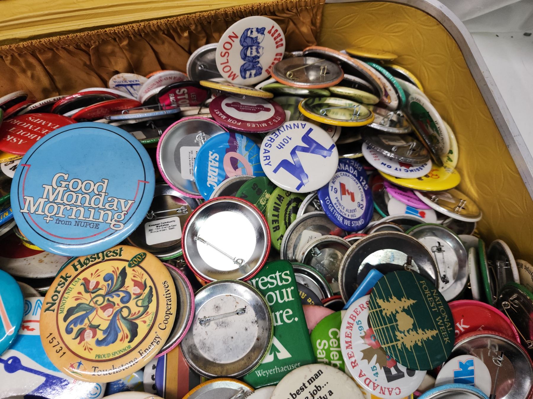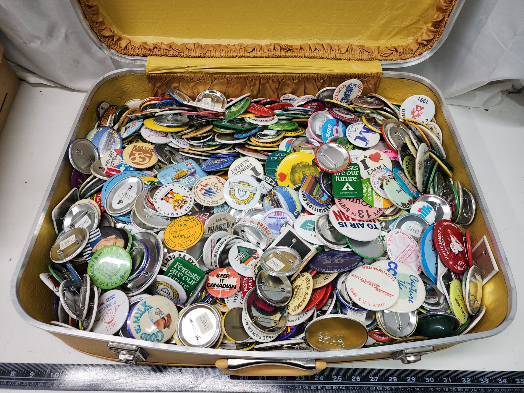 Vintage suitcase, filled w/ pin buttons