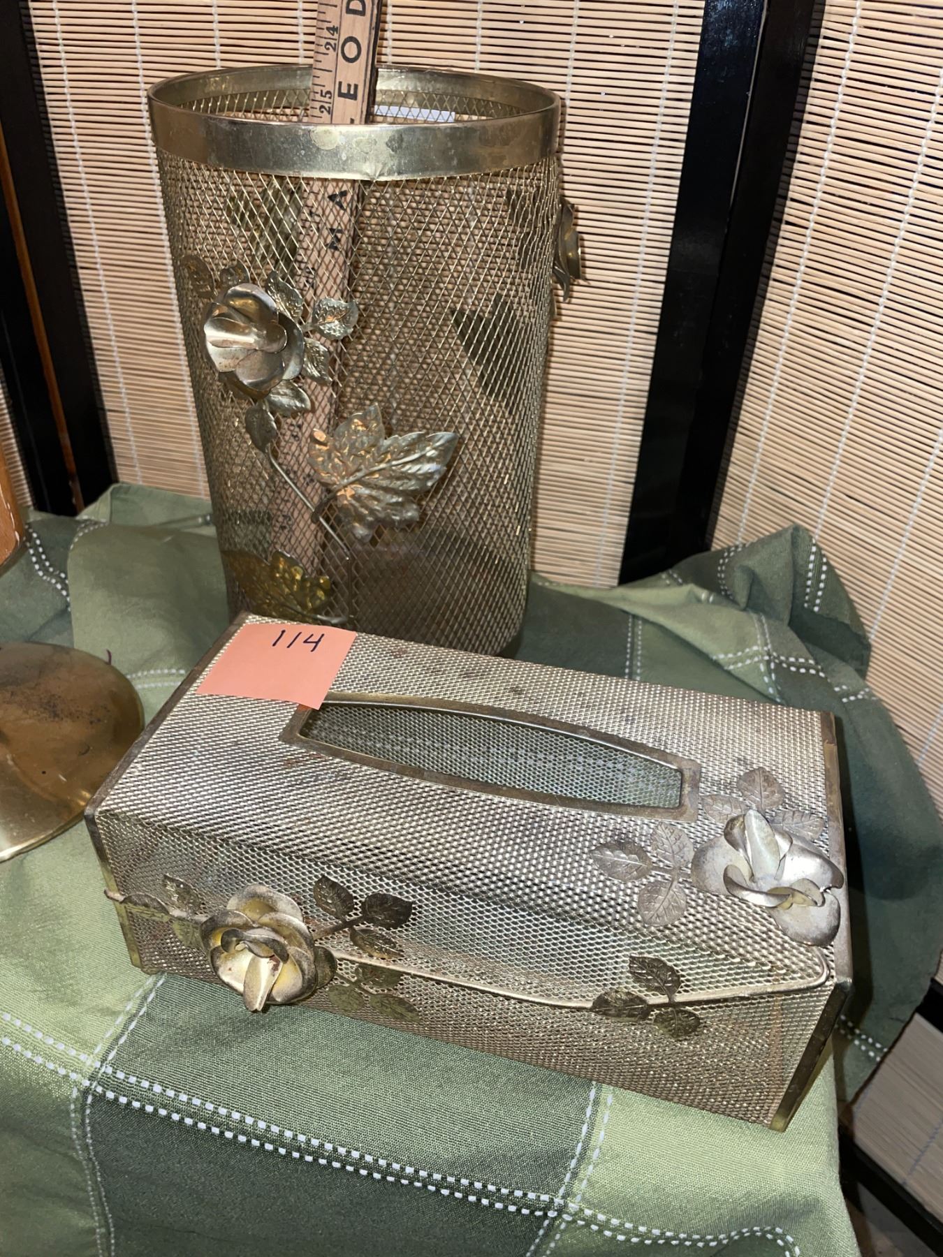 Vintage teak and brass, table lamp, with no shade, and brass, floral waste basket with matching tissue box holder, and hanging metal decor piece
