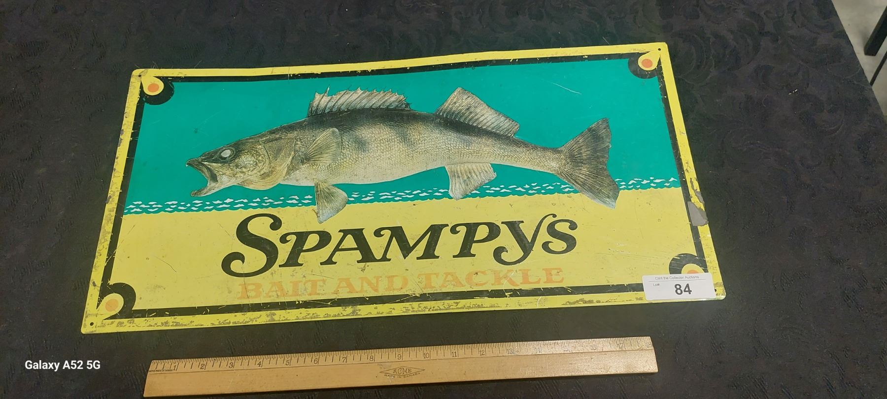 Vintage tin tacker, Spampys Bait and Tackle, fantastic graphics 24"x12"