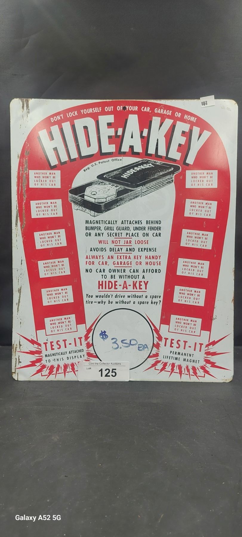 Vintage tin tacker sign, Hid-a-Key, 15"x12"