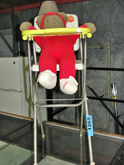 Vintage tin toy high chair with teddy bear
