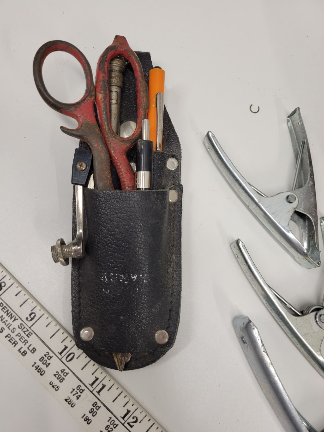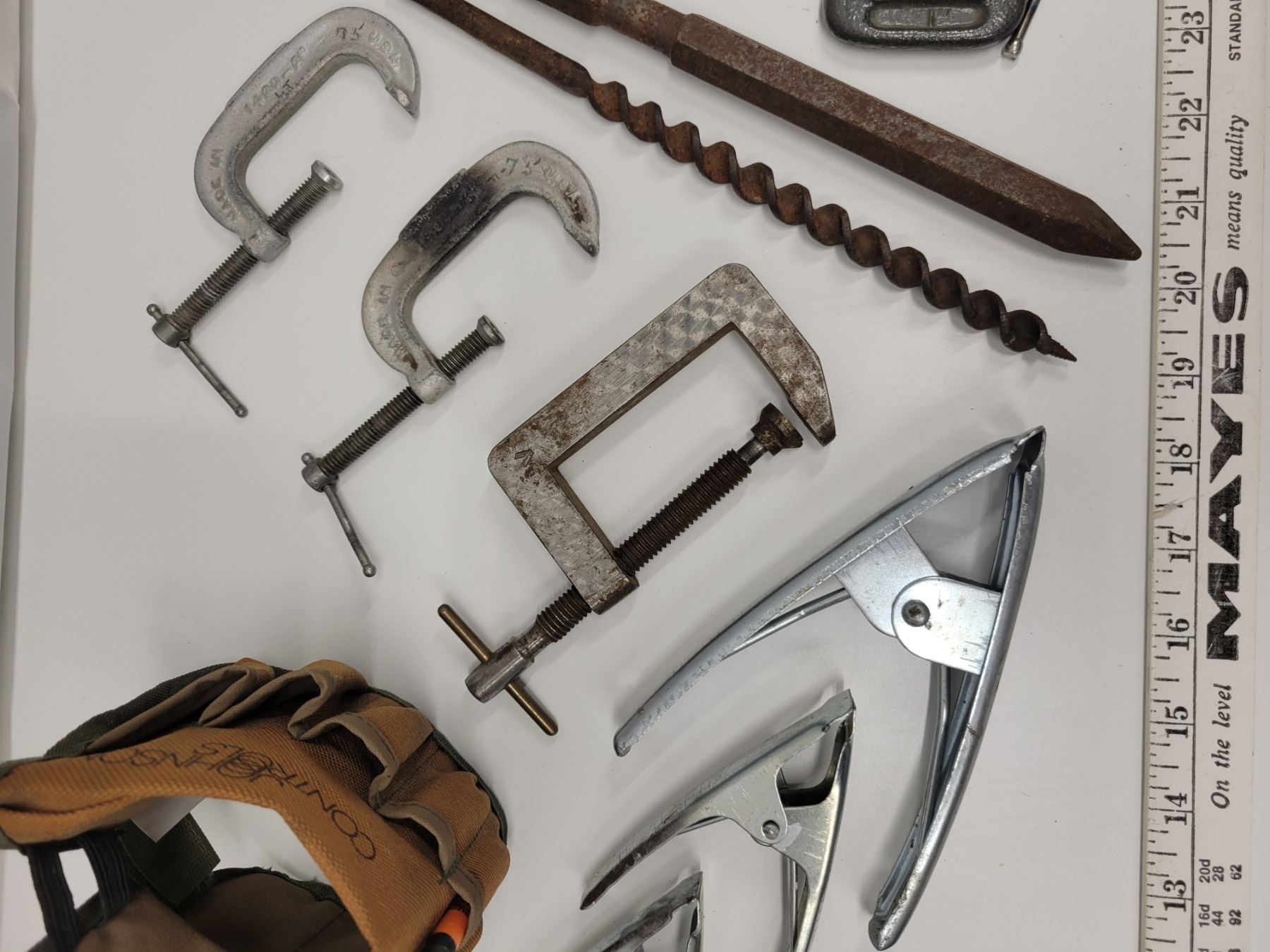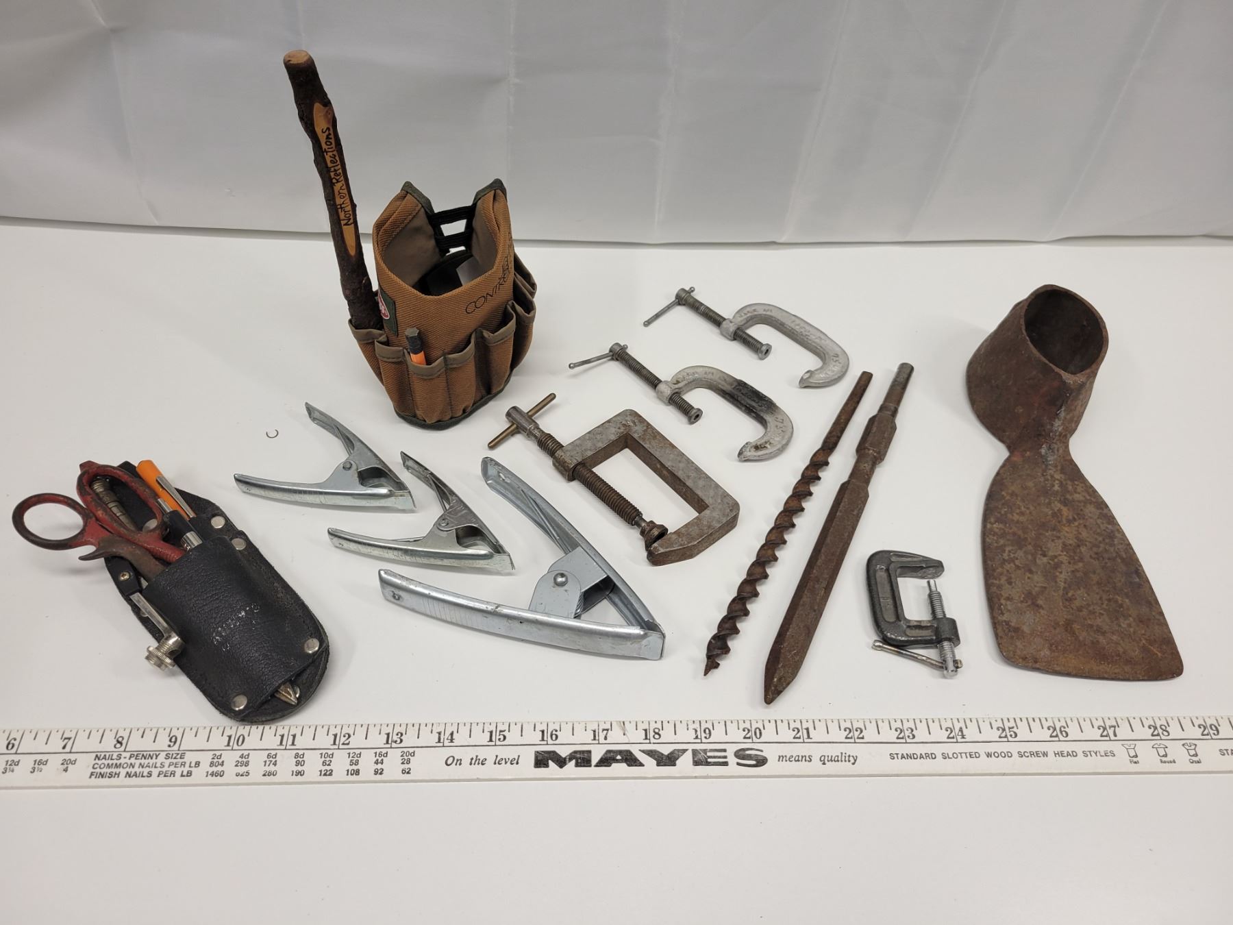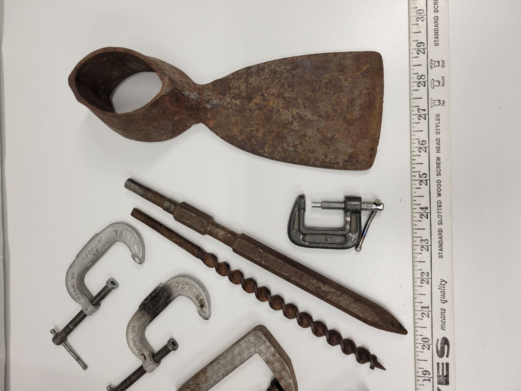 Vintage tool lot including old drill bits and grub hoe