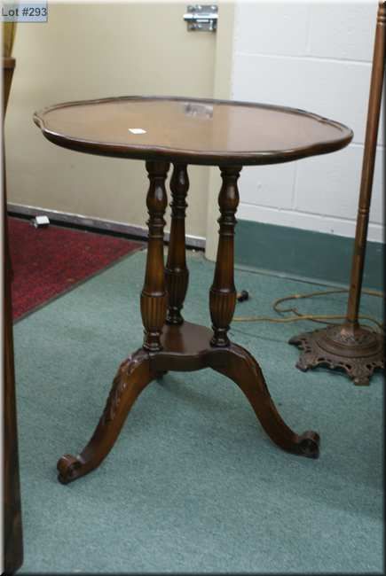 Vintage walnut triple column, center pedestal occasional table with carved highlight