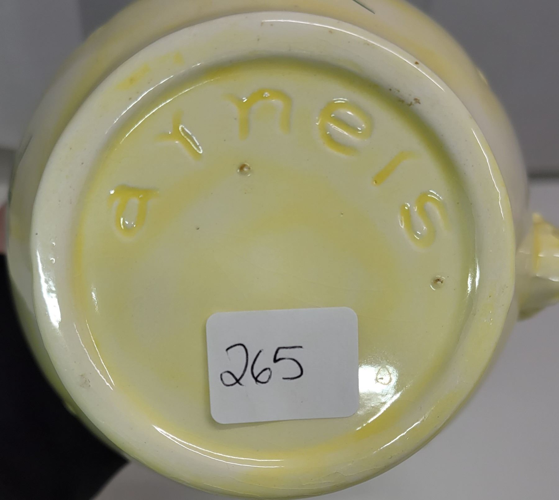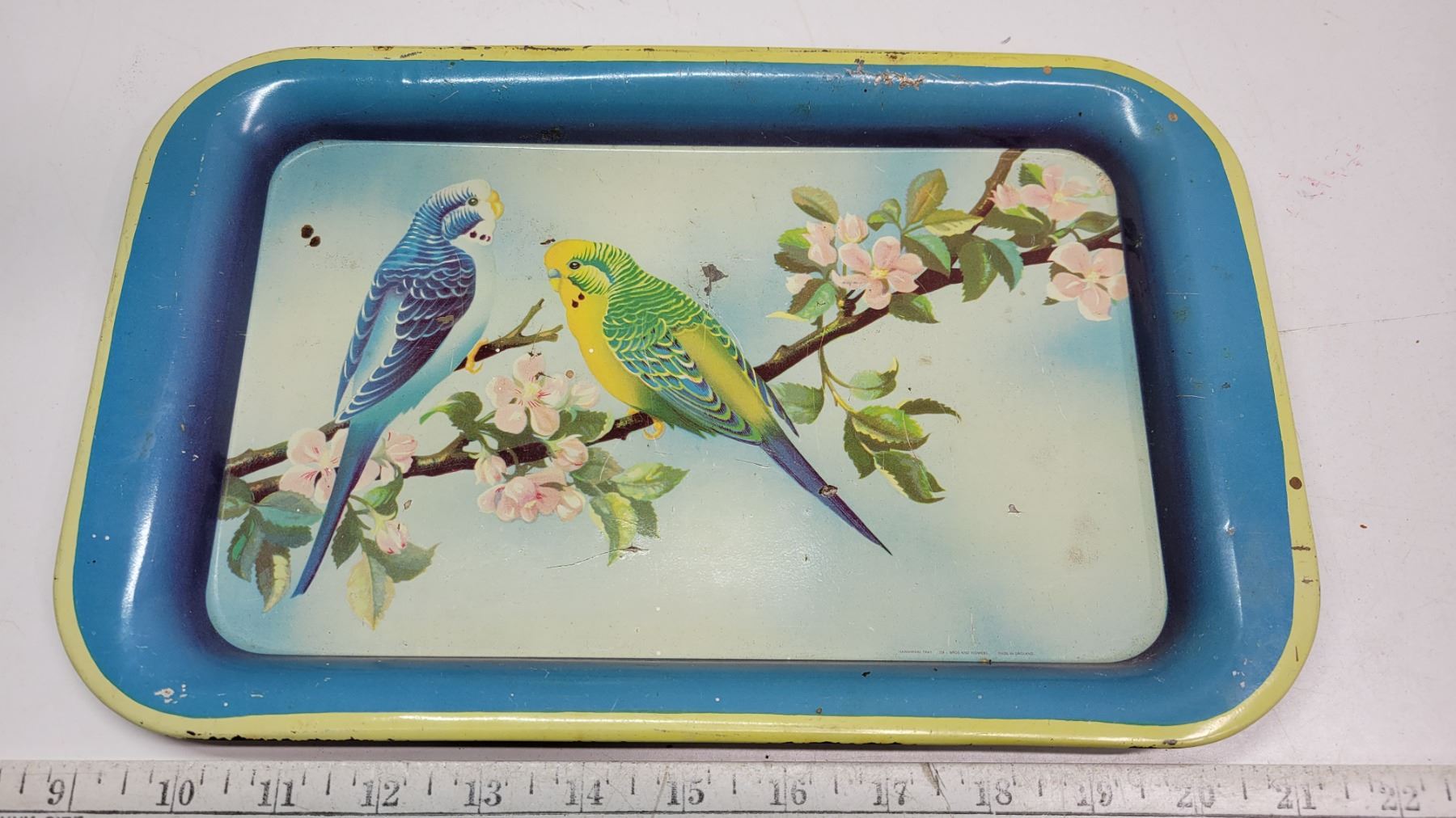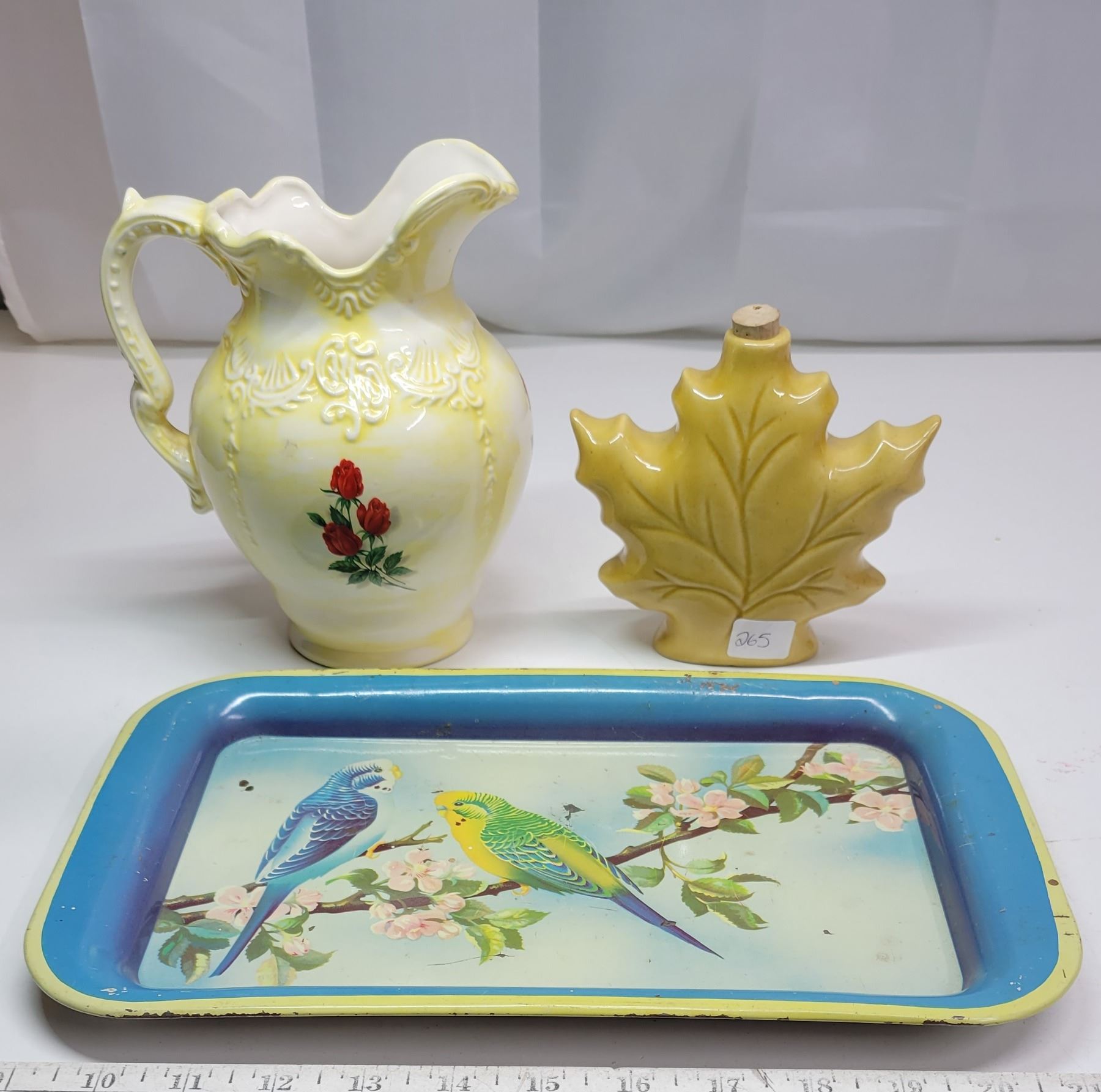 Vintage ware – Parakeet Metal Serving Tray, “Aynels” Pitcher, Canada #3917 Maple Syrup Pottery Container