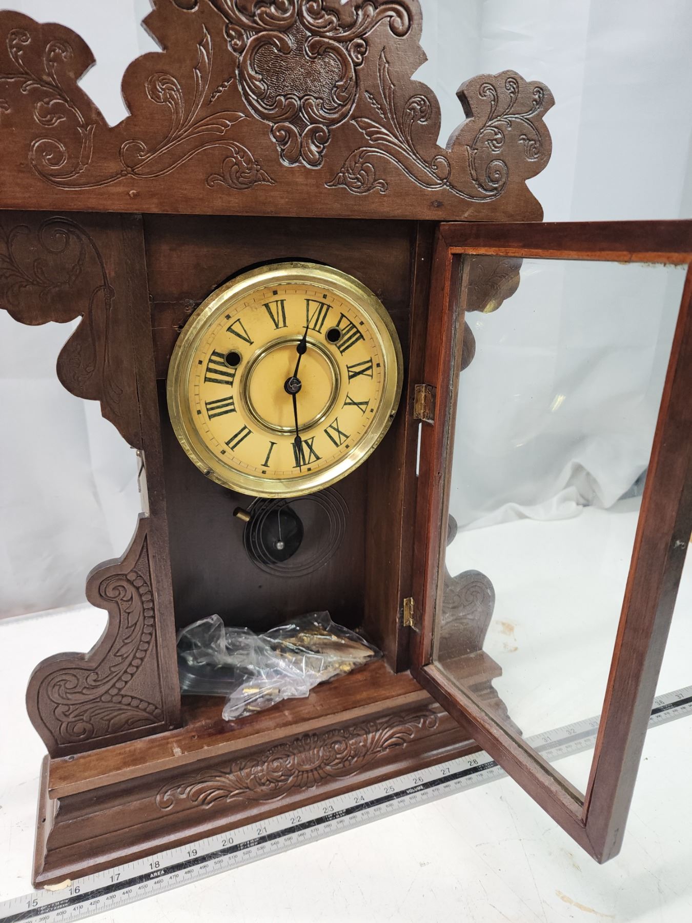 Vintage wind up gingerbread style clock, w/ pendulum and key - 15"x23"H