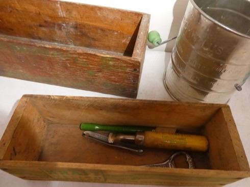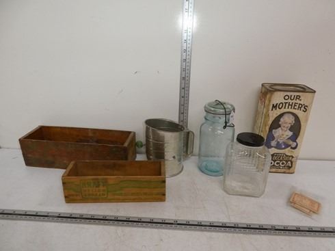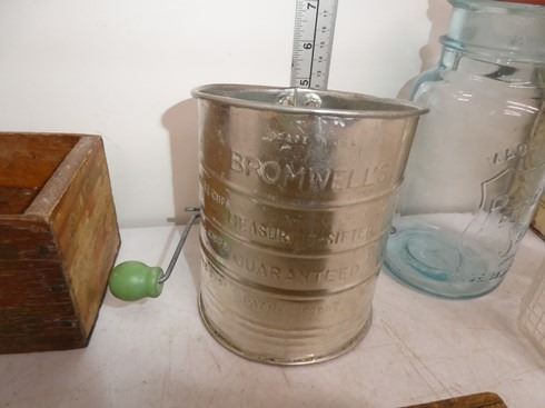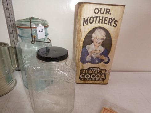 Pantry Jar, bromwells's measuring sifter, vintage cocoa tin