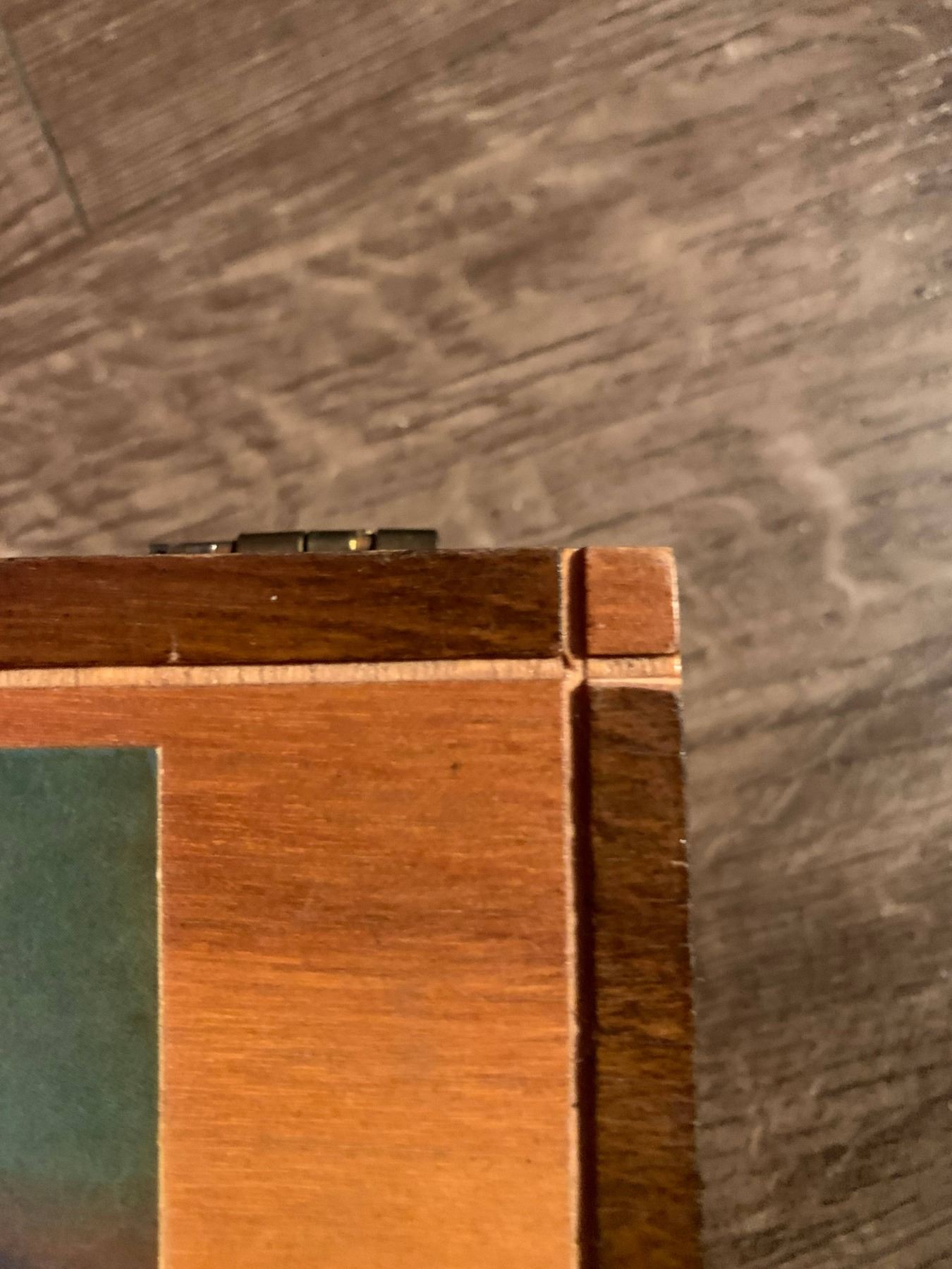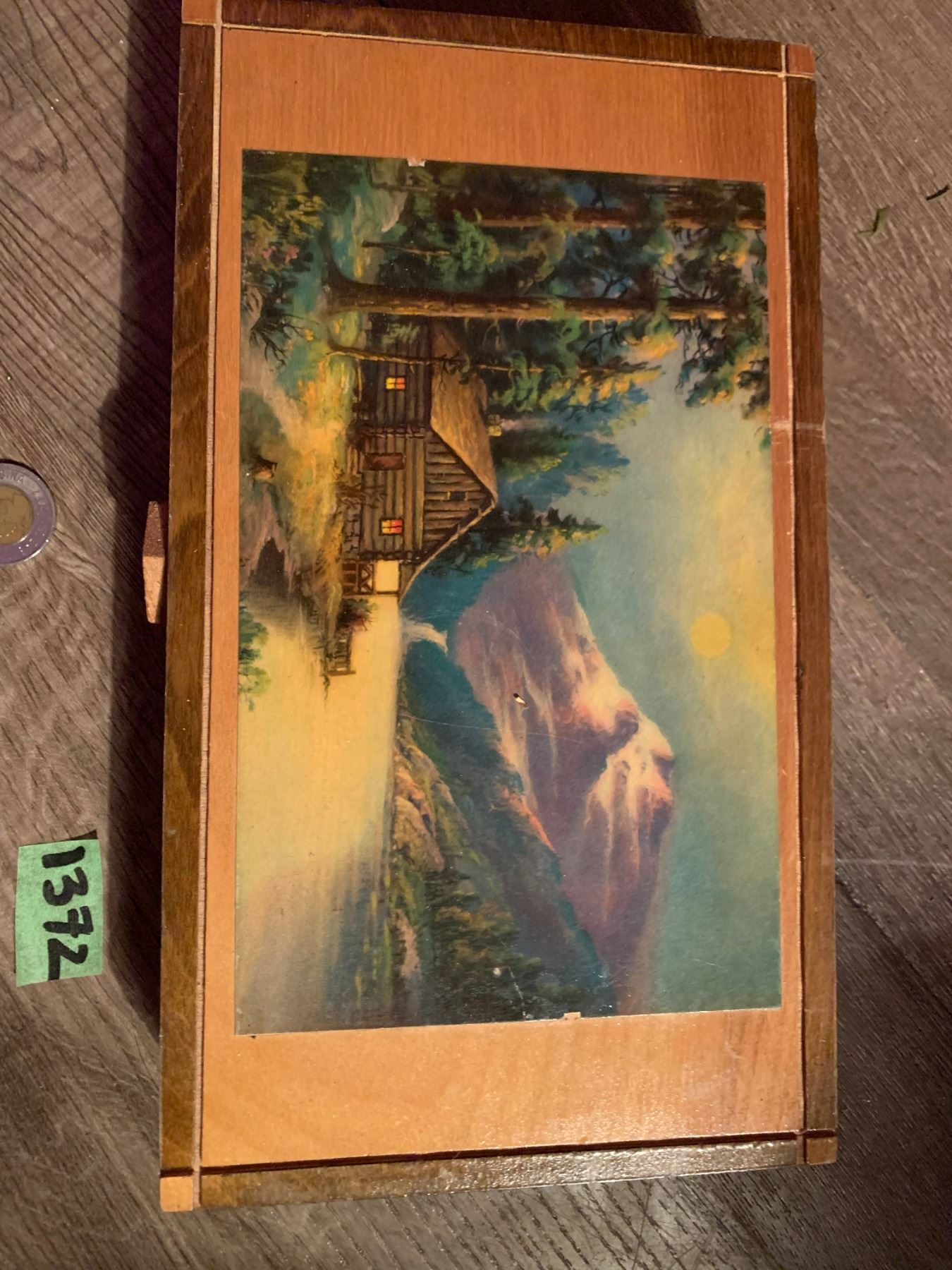 Vintage wooden box with cabin scene on front- box has some wear on the inside but is in excellent condition on the outside