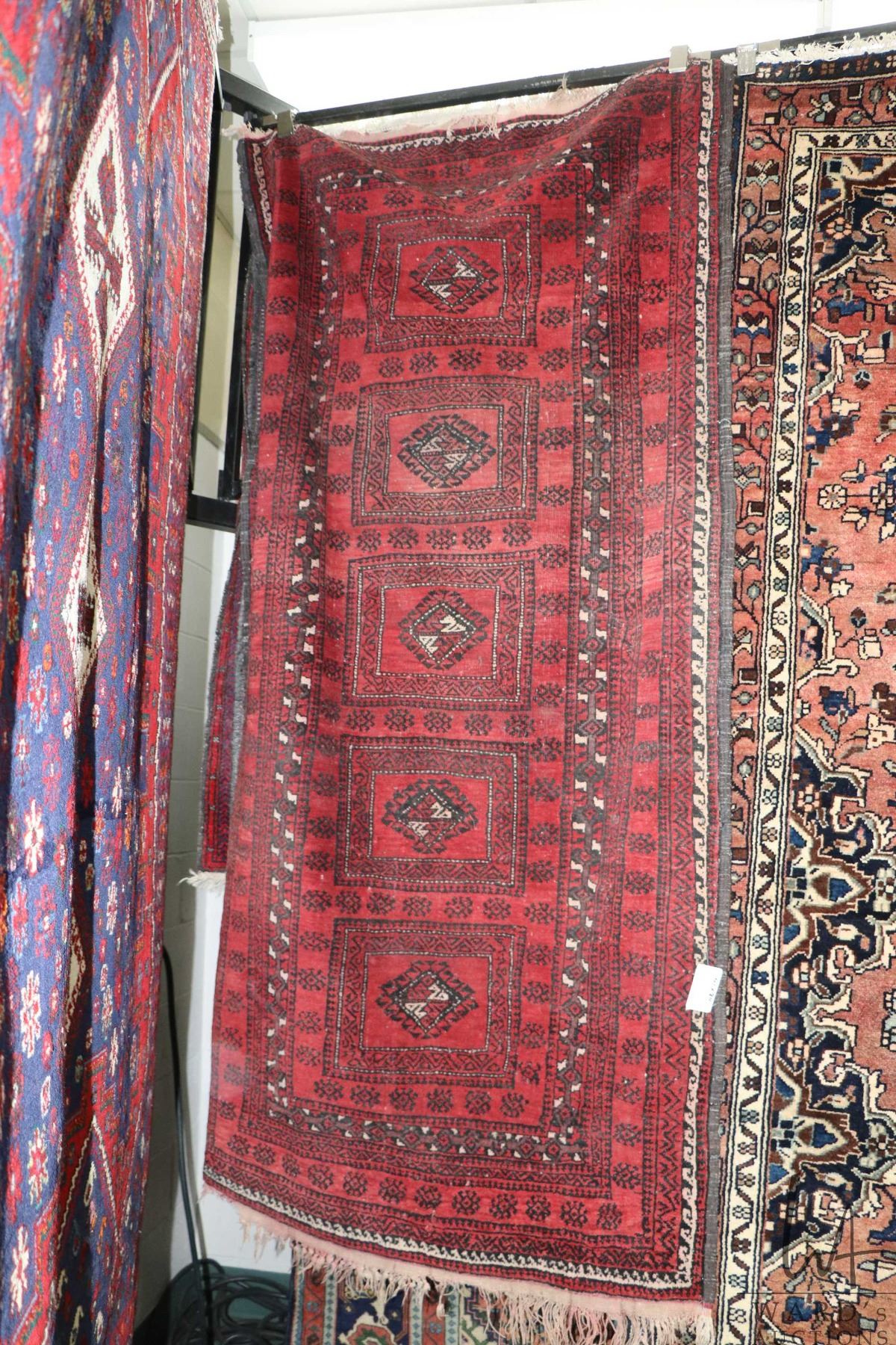 Vintage wool area carpet with multiple medallions and red background, highlights of black, taupe etc. 41" X 84"
