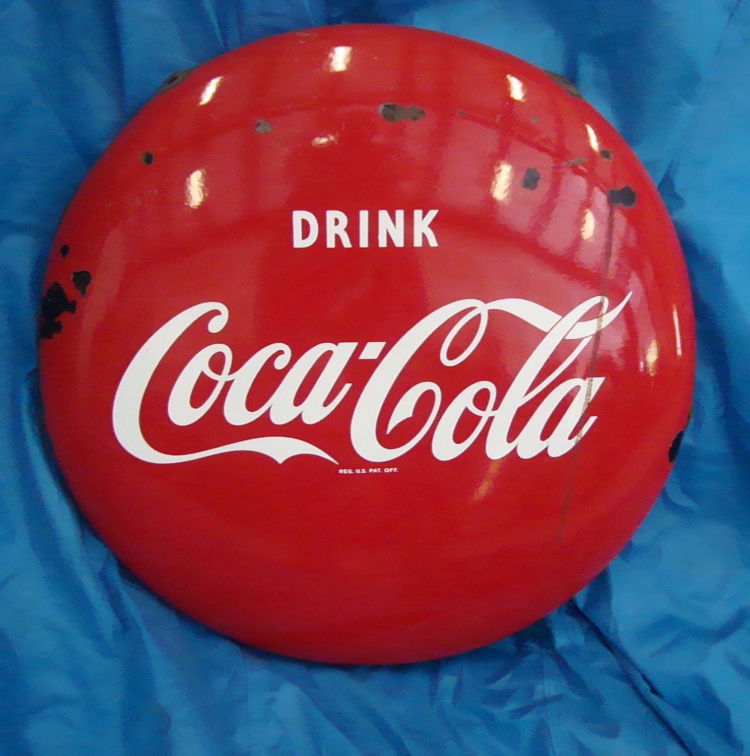Nice honest unrestored original circa 1950's Coca-Cola Metal Button Sign. Exactly the same sign you would see on the Andy Griffth Show or your neighborhood Texaco Station.