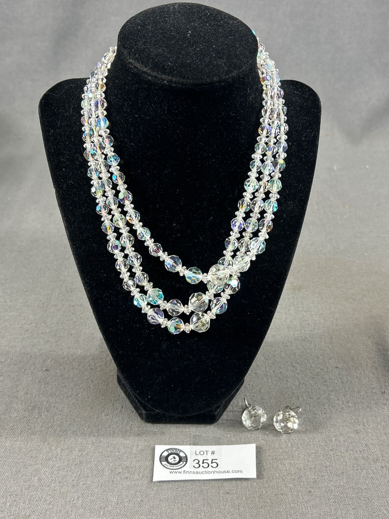 Vintge 3 Strand Crystal Necklace with Crystal Earrings
