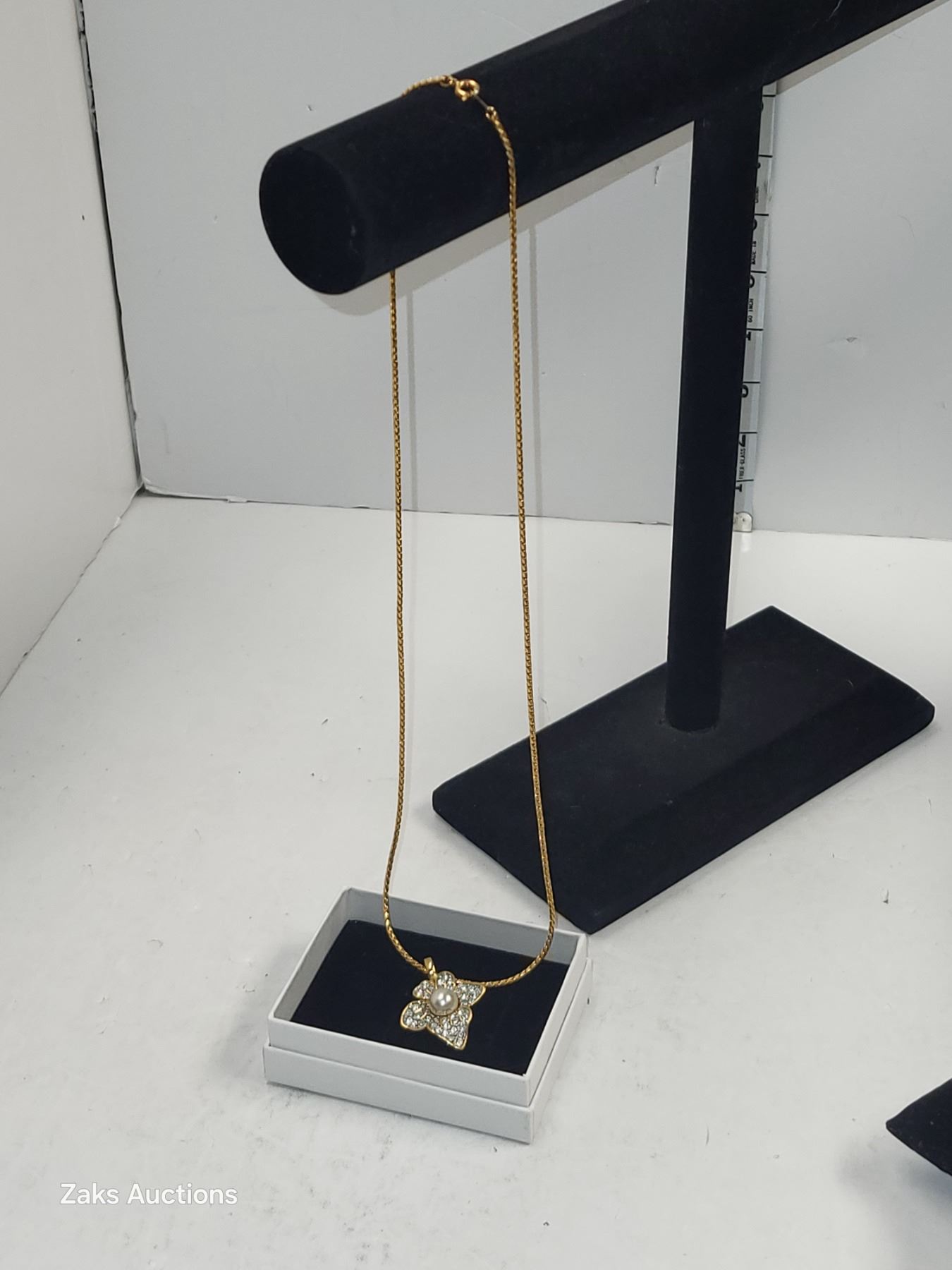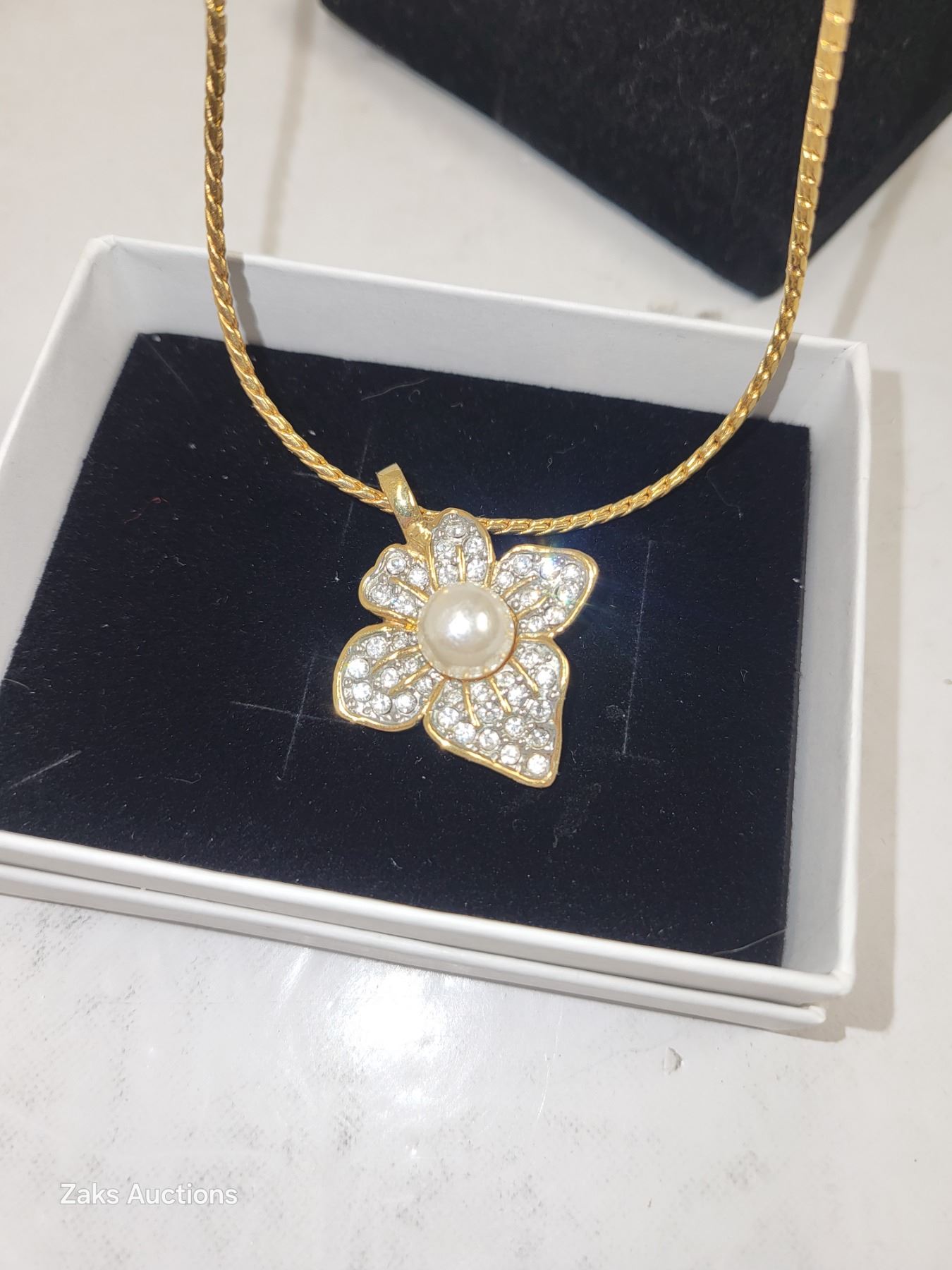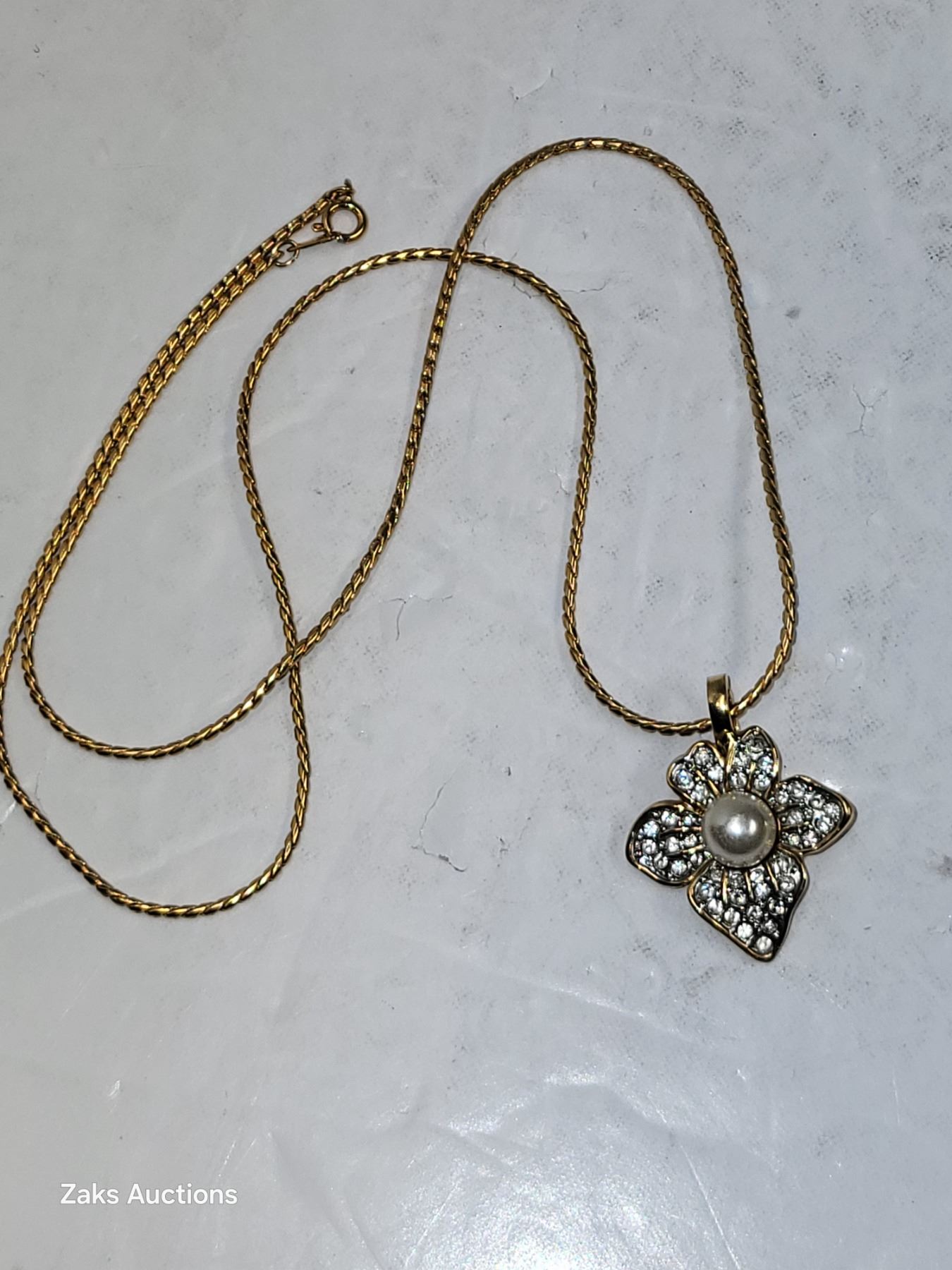 Vintge Signed Butler Simulated Pearl & Crystal Pendant Necklace