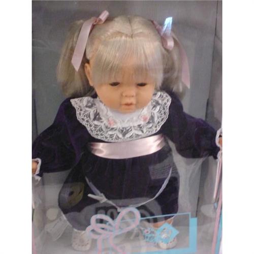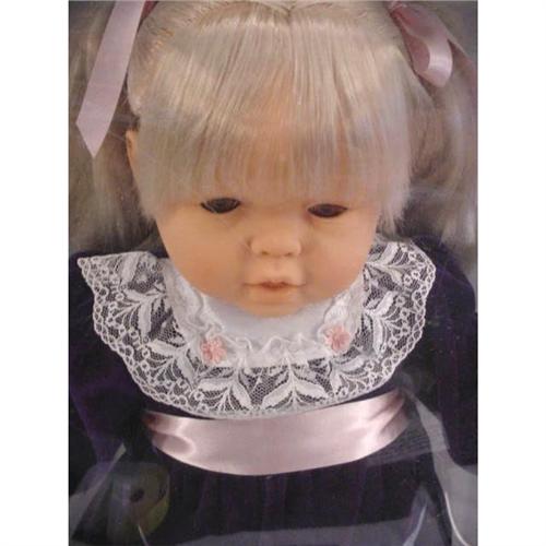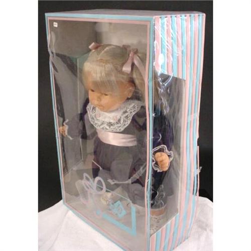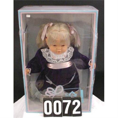 This is a cute doll with vinyl head, hands, feet wearing a royal blue velveteen long sleeved dress with a lacy white yoke and has ash blond hair in pigtails and sleeping eyes 22" high. She is in the original box in mint condition. approx 22" x 14" x 6" 3 lb. [81]