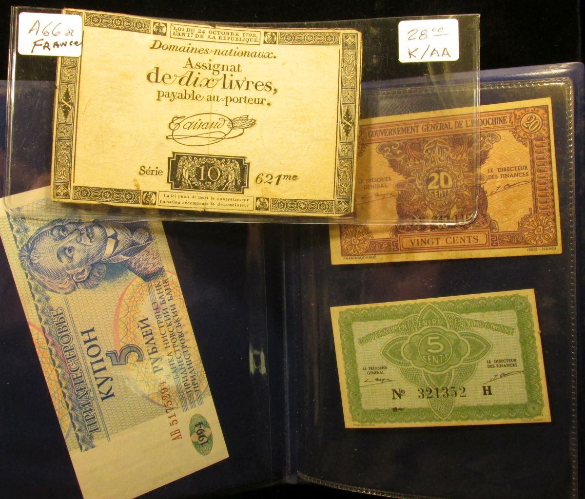 Vinyl Currency holder with a few scarcer foreign Banknotes including a France, A66 Series 10 dated October 24, 1792.