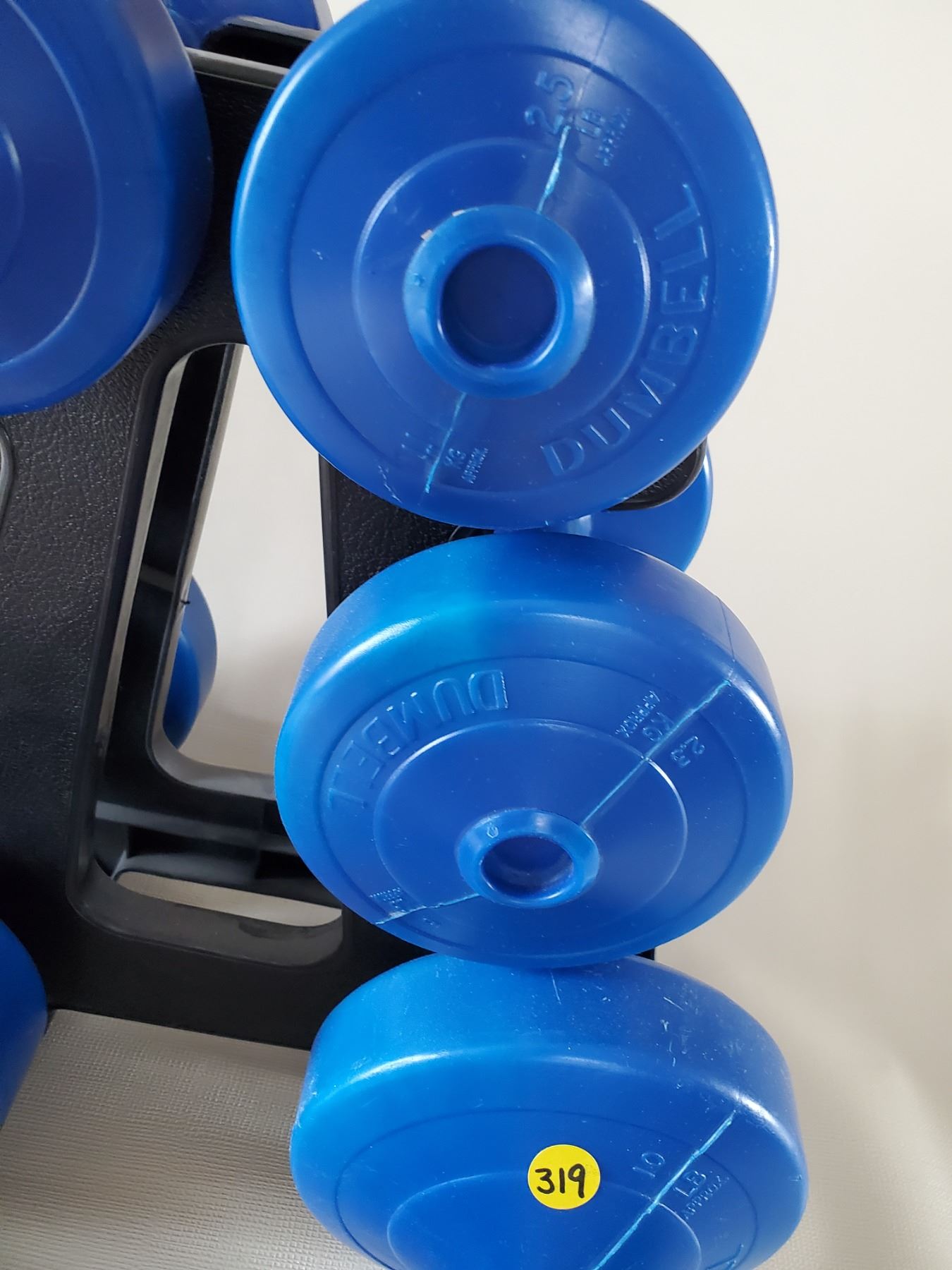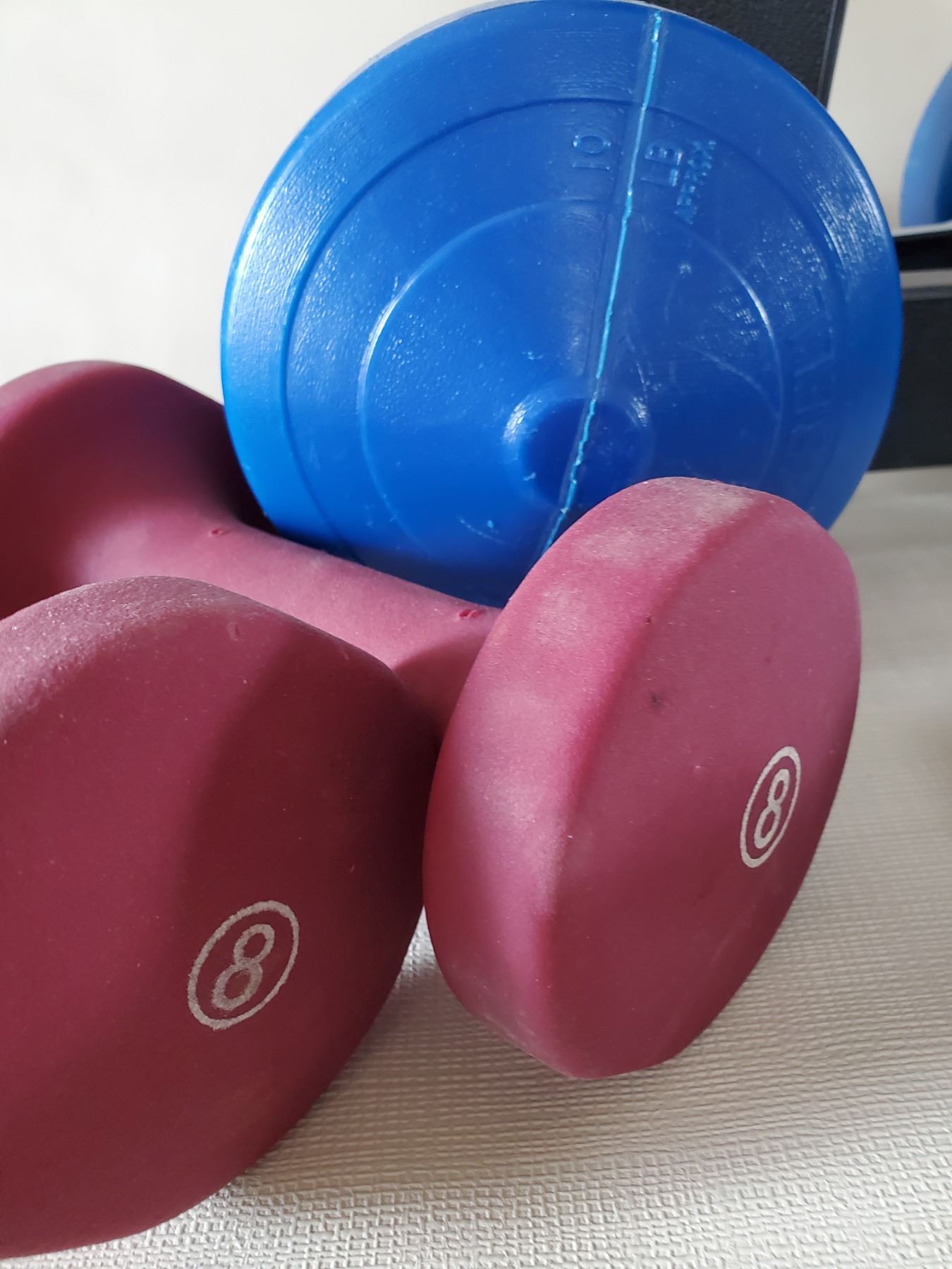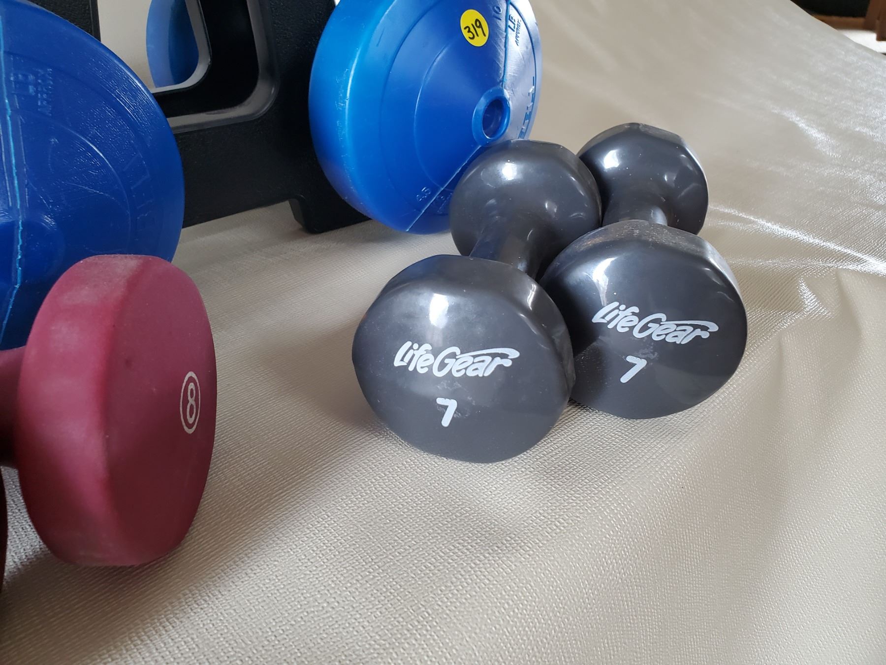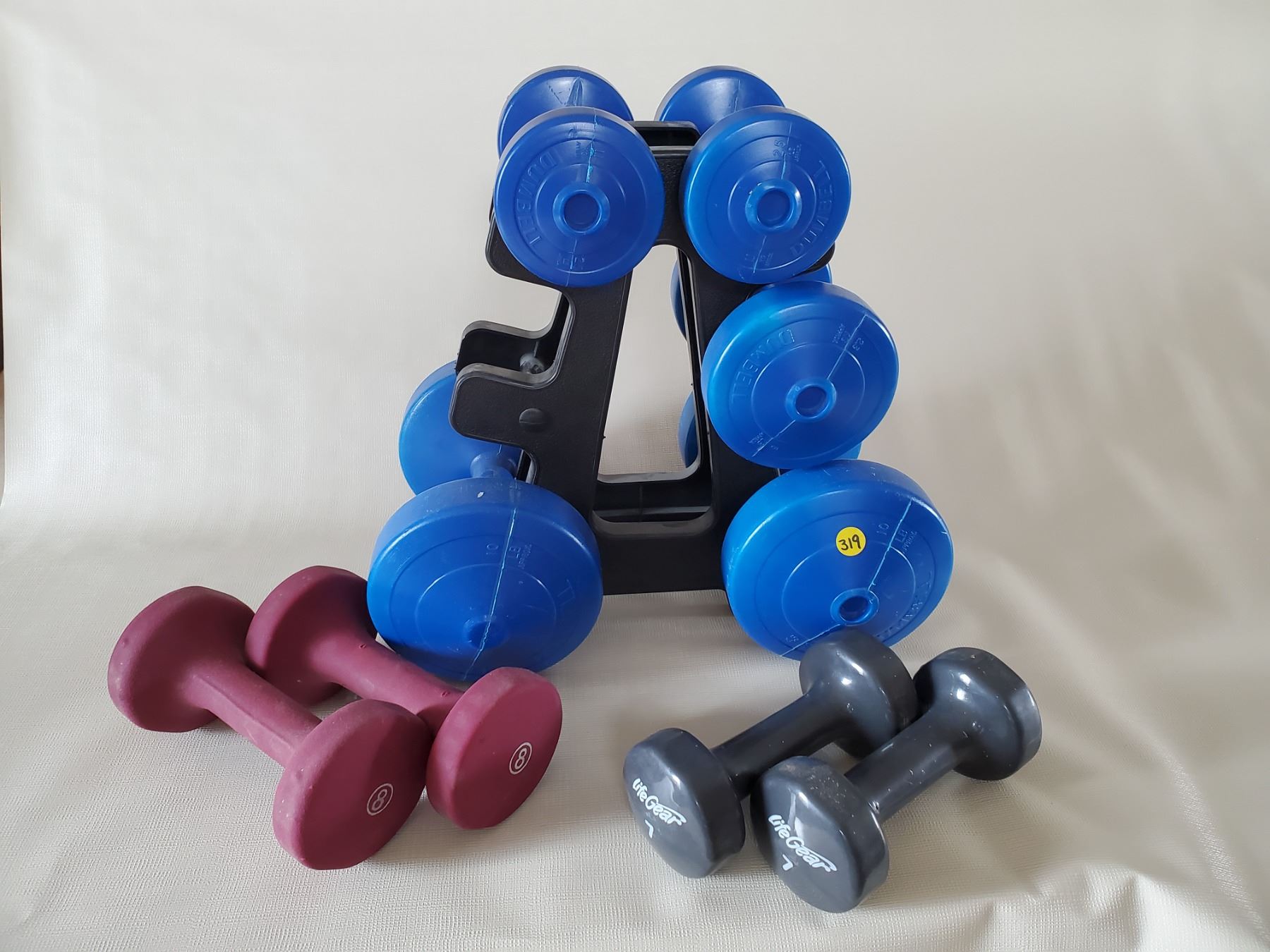Vinyl Dumbbells 2 @ 7lbs., 2 @ 8 lbs., 2 @ 2.5 lbs., 1 @ 5 lbs, 2 @ 10 lbs.