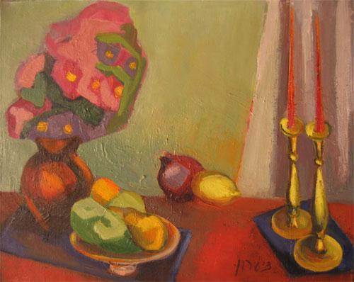 Violet Citron, 1901 - 1995, Flowers and Candlesticks, 1969, Oil on canvas, 55x71 cm, Signed. Signed again and dated on the reverse., , , , ,