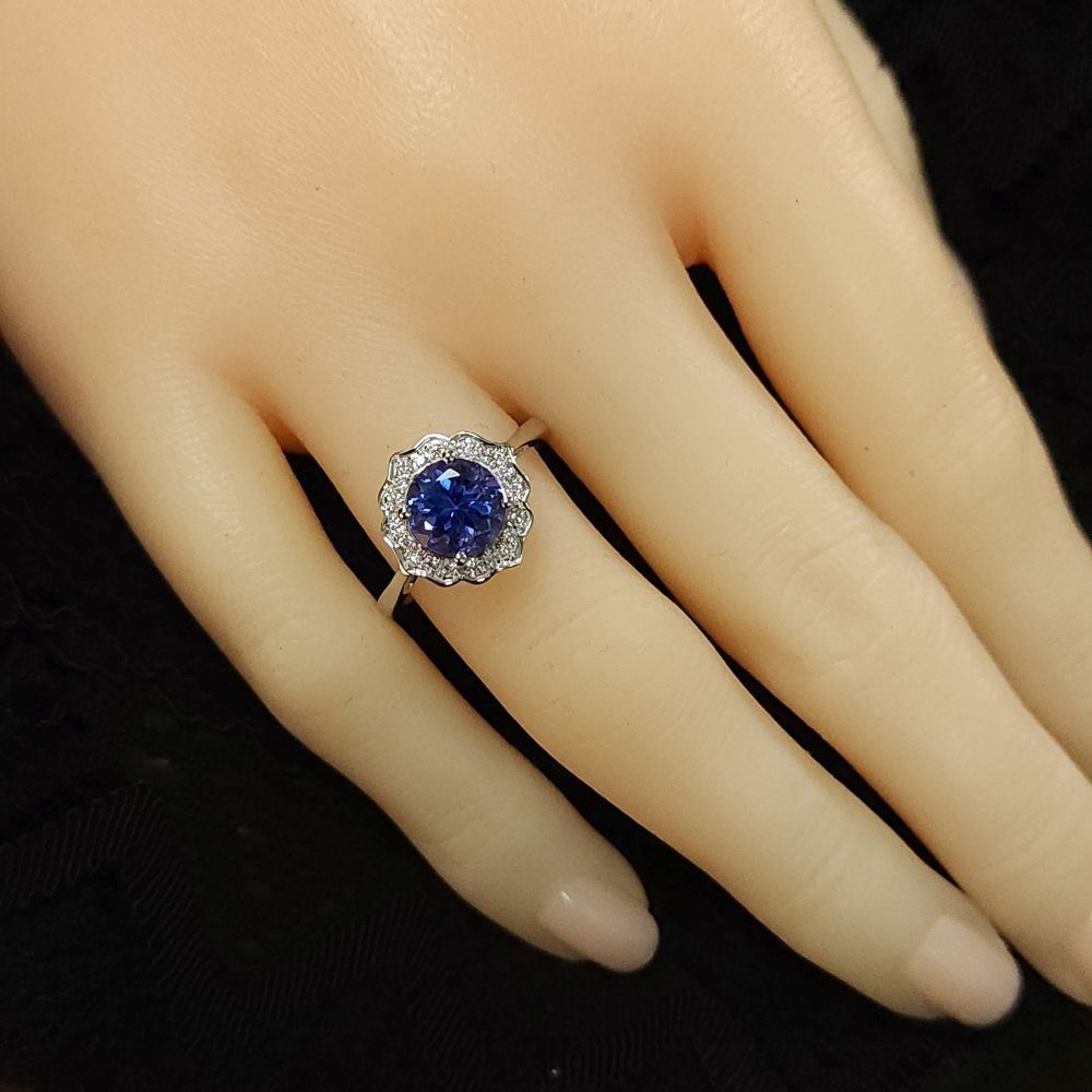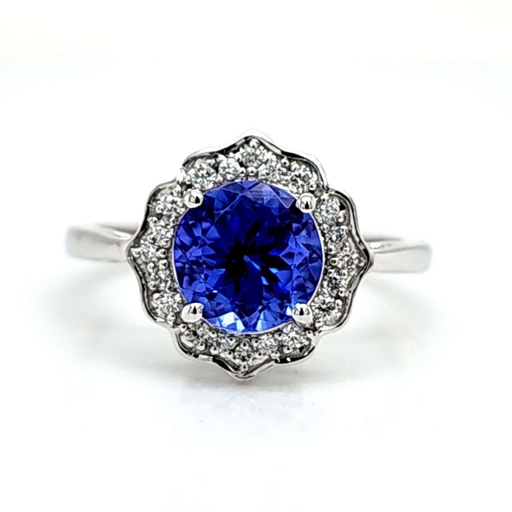 ADDITIONAL INFORMATION:& nbsp; Who doesn't love jewelry AND flowers?! Why not have both, in one ring! This white gold ring with a round, faceted tanzanite is prong-set with round, brilliant-cut, diamonds in the petal-shaped halo. This ring has an approximate 2.2mm shank and a supportive gallery.& nbsp;