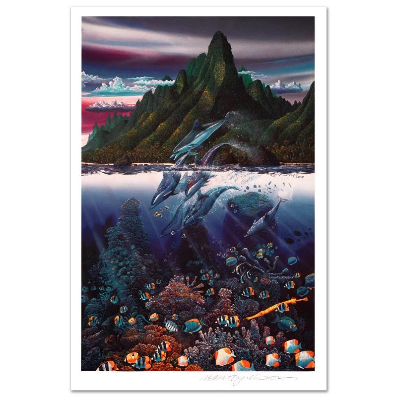 Captivating audiences worldwide, Nelson dazzles all with his incredible use of color and depth. "Violet Hues of Moorea" is a limited edition mixed media on paper, numbered and hand signed by the artist! Includes Certificate of Authenticity! Measures approx. 14" x 20" (with border), 12" x 17.5" (image).