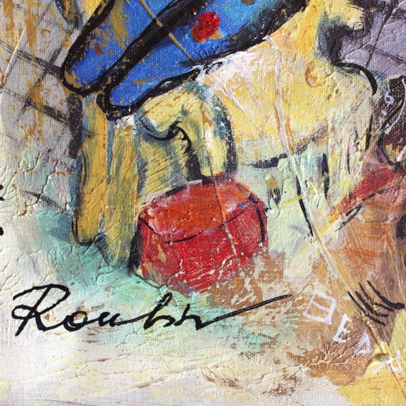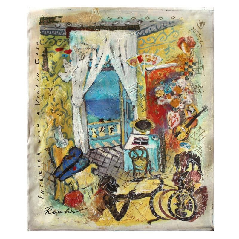 "Violin Case" is an original Acrylic on Canvas by Olga Roubin. The piece is hand signed and comes with a Certificate of Authenticity. Measures approximately 19.5" x 23.5".