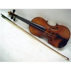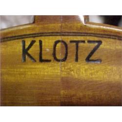 Violin and bow, violin measures 23 1/4", signed Klotz, tigering on back and neck, missing tuning peg, scratches under bridge piece, leather case, rosin in box, bow signed "tourte model", needs to be restrung Estimate 150/300