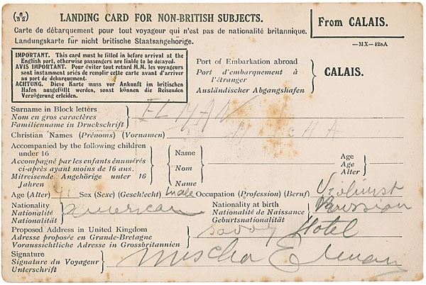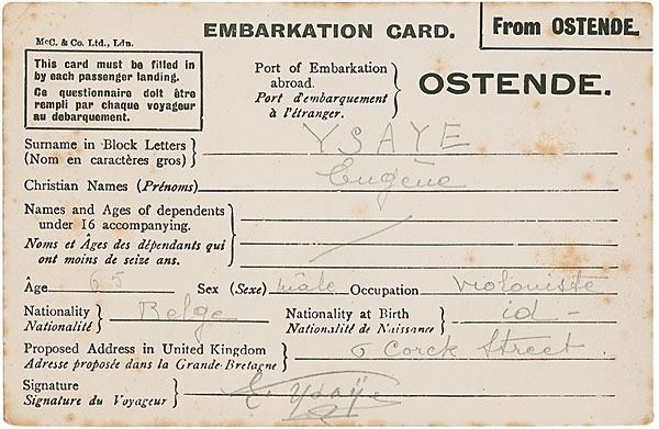 Three rare embarkation cards, each one page, 6 x 4. One dated 1932, one 1924, and the third is not dated. Each embarkation card is filled out in pencil by the signer, two are from Mischa Elman and one is from Eugene Ysaye. Each document includes their full name, age, occupation "violinist," and proposed address in the UK. Each are signed at the bottom in pencil. In overall very good to fine condition, with scattered foxing to two of the cards. Embarkation cards, also known as departure cards, are used by immigration authorities as a means of passenger identification and as a record of entry and departure between countries.