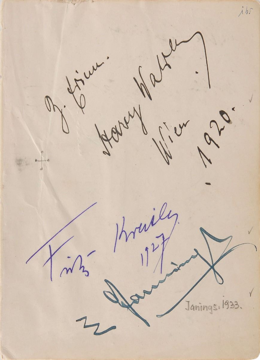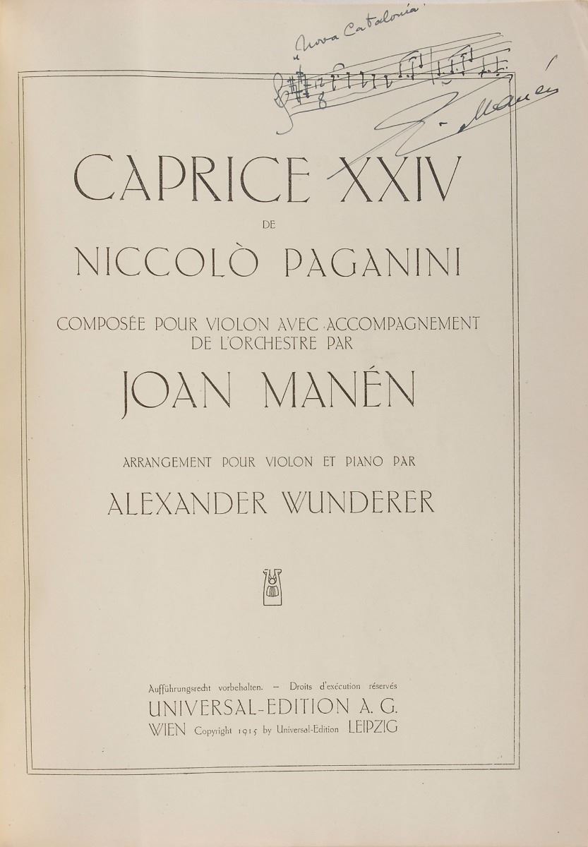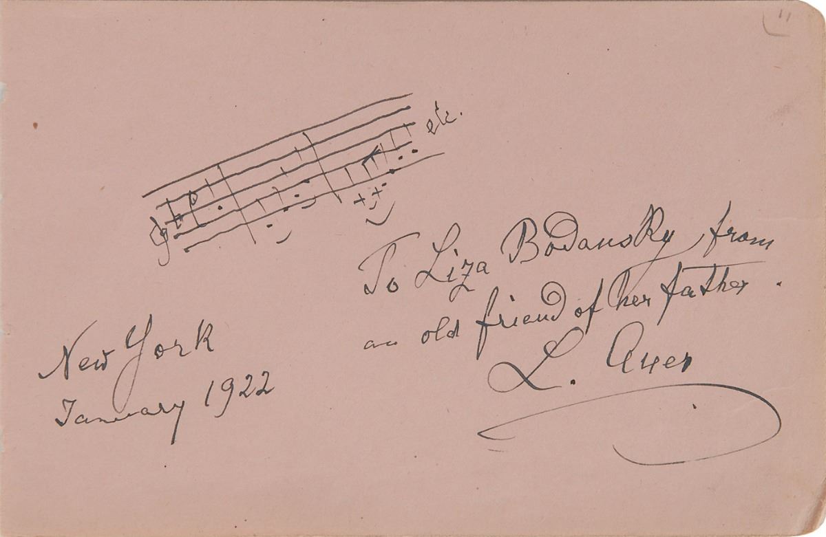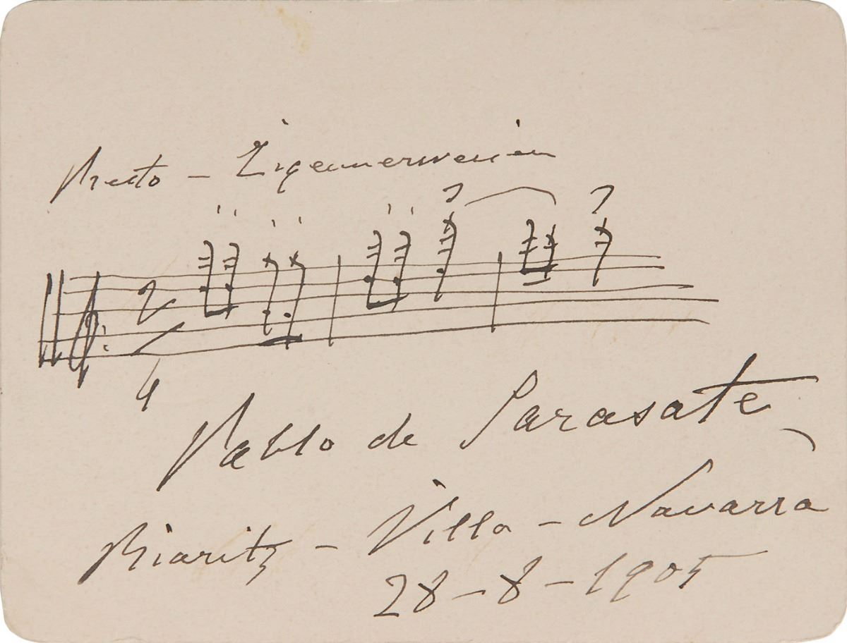 Four items: an AMQS by Pablo de Sarasate on an off-white card, featuring three bars from Zigeunerweisen, one of his most famous works; an AMQS by Leopold Auer on a pink album page, signed and inscribed to the daughter of conductor Artur Bodanzky; a fountain pen signature of Fritz Kreisler on an off-white album page, also signed by actor Emil Jannings; and a sheet music booklet for Paganini’s Caprice XXIV by Joan Manen, featuring an AMQS by Manen on the title page from his Nova Catalonia. In overall fine condition.