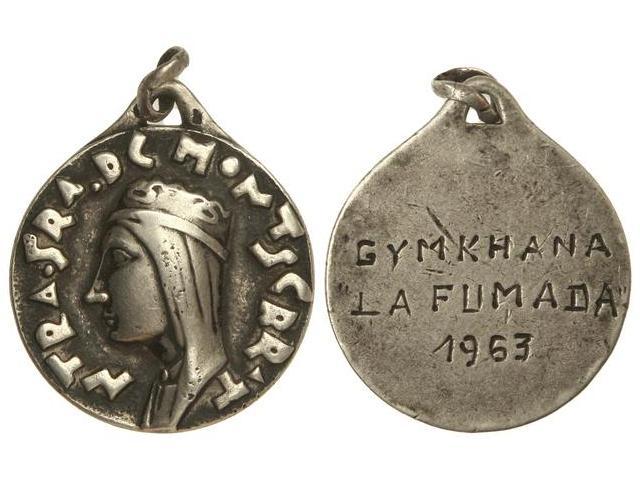 Virgen de Montserrat. - 1963. - Anv.: NTRA. STA. DE MONTSERRAT. Busto a izquierda. Rev.: GYMKHANA ´LA FUMADA´ 1963. Metal plateado. Ø 25 mm. Con anilla algo doblada. MBC+. - -
