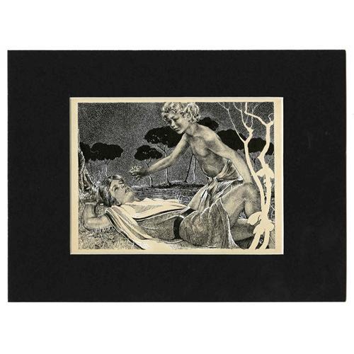 <B>Virgil Finlay - "A Midsummer Night's Dream," page 29 Illustration Original Art (Popular Fiction Publishing Co., 1935).</B></I> The combination of William Shakespeare and Virgil Finlay must be counted as one of the most enchanting pairings ever in the history of modern American illustration! This bewitching scene illustrated Act II, Scene I, of <B>A Midsummer Nights Dream</B></I> and its caption read, "The juice of it, on sleeping eyelids laid, Will make or man or woman, madly dote Upon the next live creature that it sees." The illustration has an image area that measures 7" x 5.25", and the art is in Excellent condition.
