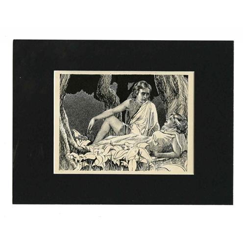 <B>Virgil Finlay - "A Midsummer Night's Dream," page 35 Illustration Original Art (Popular Fiction Publishing Co., 1935).</B></I> Virgil Finlay's committment to his art was unsurpassed. As a result his popularity was always high. Throughout the forties and fifties he was the top science fiction fan-favorite. As illustration historian Jim Vadeboncoeur Jr. has written, "What was at issue was always his speed. The painstakingly slow techniques that resulted in the inimitable Finlay magic could not be rushed. Short cuts resulted in less satisfaction for both Finlay and the readers. He often did nothing but draw, sixteen hours a day, seven days a week to eke out a living at the wages that the pulps and digests could afford to pay. When markets would dry up as magazines floundered he was known to take jobs repairing lamps." The caption for this scene from Act II, Scene II, of <B>A Midsummer Nights Dream</B></I> reads, "Lie further off, yet; do not lie so near." The illustration has an image area that measures 7" x 5.25", and the art is in Excellent condition.