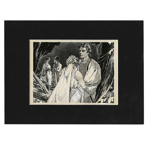 <B>Virgil Finlay - "A Midsummer Night's Dream," page 57 Illustration Original Art (Popular Fiction Publishing Co., 1935).</B></I> The quality seen in these early illustrations set the stage for Virgil Finlay's storied career. He drew hundreds of scenes for the science fiction pulps throughout the forties and fifties. Some of those titles included <B>Famous Fantastic Mysteries</B></I>, <B>Fantastic Novels</B></I>, <B>Startling Stories</B></I>, <B>Super Science Stories</B></I>, <B>Amazing Stories</B></I>, <B>Thrilling Wonder Stories</B></I>, and <B>Fantastic Adventures</B></I>. The caption for this scene from Act III, Scene II, of <B>A Midsummer Nights Dream</B></I> reads, "I will shake thee from me like a serpent." The illustration has an image area that measures 7" x 5.5", and the art is in Excellent condition.