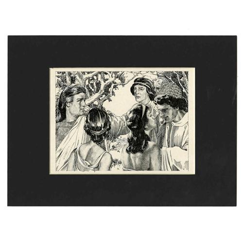 <B>Virgil Finlay - "A Midsummer Night's Dream," page 71 Illustration Original Art (Popular Fiction Publishing Co., 1935).</B></I> The illustrations of Virgil Finlay were both a popular and a critical success. As illustration historian Jim Vadeboncoeur Jr. has pointed out, "Finlay's work was an immediate hit with the readers and the writers. Readers wrote in praising the illustrations. H.P. Lovecraft wrote him fan letters and even composed a poem about his art. Finlay was a fan of the genre as well as one of the most talented artists to enter the field. These combined to provide his work with a power and grace unknown in the pulps." The caption for this scene from Act IV, Scene I, of <B>A Midsummer Nights Dream</B></I> reads, "I know you two are rival enemies; How comes this gentle concord in the world?" The illustration has an image area that measures 7" x 5.25", and the art is in Excellent condition.