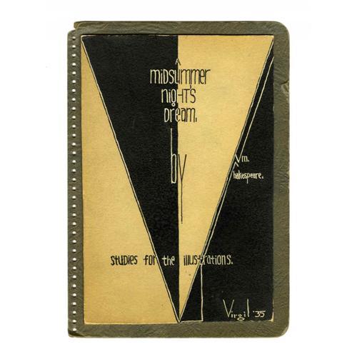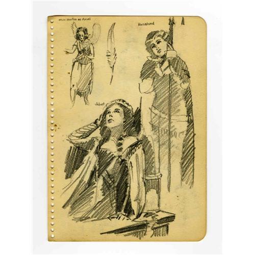 <B>Virgil Finlay - "A Midsummer's Night Dream" Sketch Original Art, Group of 42 (Popular Fiction Publishing Co., 1935).</B></I> Virgil Finlay imaginative and appealing illustrations make the unknowable seem so immediate and real. His distinct, jewel-like renditions employ the painstaking stipple and crosshatching technique of an earlier era of illustration. From his gorgeous women to his terrifying monsters, to scenes from legendary pasts and fantastic futures, Finlay's delicate, precise style is truly inspiring. In addition to commissioning Finlay to draw multiple illustrations in nearly every issue of <B>Weird Tales</B></I> through 1939, its editor, Farnsworth Wright, chose him to illustrate the first in a proposed series of illustrated reprints of Shakespeare's plays, <B>A Midsummer Night's Dream</B></I>, which was published in 1936. Contained in this 5" x 7" sketchbook (with a hand-drawn cover), is a stellar selection of 42 preliminary studies that Finlay created for the project. There is a bit of aging apparent, otherwise, the work is in Very Good condition.