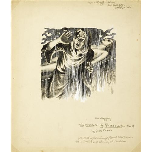 <B>Virgil Finlay - Argosy V296#1, January 6, 1940 Illustration Original Art (Munsey, 1940).</B></I> This lushly detailed "drybrush" ink drawing by Virgil Finlay was used to illustrate a scene from the chiller,"The Maker of Shadows, Part 5," written by Jack Mann (the pen name of E. Charles Vivian). Finlay's penciled production notes read, "Illustrating the burning of Gamel MacMorn at his attempted invocation of the maiden." This spectacular piece has an overall size that measures approximately 8" x 9.5", and the art is in Excellent condition.<BR><BR><b>Shipping:</b> Large Flat (<a target="_blank" href="http://www.heritageauctions.com/common/shipping.php">view shipping information</a>)