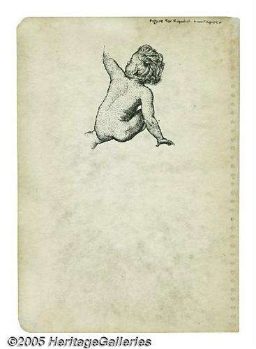 <B>Virgil Finlay - Cupid Study Illustration Original Art (1935).</B></I> A sensitive study of the figure of cupid reveals the immense talent for drawing that Virgil Finlay had, even at an early age. This figure was used in the background of the finished illustration for the frontispiece of <B>A Midsummer Night's Dream</B></I>, perhaps Finlay's earliest published work. Drawn with a stipple technique in ink on paper from a spiral-bound sketchbook, the page has an overall size of 5" x 7", while the image of Cupid is about 2.5" tall. This page was deacidified and buffered by a professional conservator. The drawing was also professionally split from the opposite side of its sketchbook page and lined to Japanese paper; otherwise it is in Excellent condition.