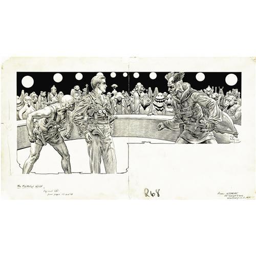<B>Virgil Finlay - Galaxy #123, June, 1963 Illustration Original Art (Galaxy, 1963).</B></I> When one discusses the great masters of 20th century science fiction illustration, Virgil Finlay's name is invariably mentioned near the top of the list. One of the most prolific and most respected science-fiction/fantasy artists of any age, Finlay's talent was as broad as his imagination. The piece offered here was created as an illustration for Gordon R. Dickson's story "The Faithful Wilf" (on pages 17 and 18), and has an overall size of approximately 16" x 9". The assortment of alien races shown here will remind some science-fiction fans of the cantina scene from "Star Wars!" This scene is rendered with a sensitively tapered line that rivals fellow pen-and-ink legend, illustrator Franklin Booth. Signed at the lower right. Aside from a fold in the center of the drawing, the art is in Very Good condition. <BR><BR><B>Important notice:</B> Heritage usually auctions material at the rate of 200-250 lots per hour. On some occasions eBay Live bid software or the Internet may not be able to keep up with the pace of the auction. We recommend placing a realistic absentee bid now as insurance to avoid disappointment. Occasionally the auctioneer may eliminate or reject an eBay Live bid, and the auctioneer may also reopen a lot after the close of the eBay live bidding (usually because we missed an audience bid), and may reject your bid even if it shows you as the winning bidder. By bidding via eBay Live, you agree that Heritage may award the lot to another bidder at its sole discretion under the circumstances described above or any other reasonable circumstances. Since eBay bids are not shown to us until we open the lot on the floor, we treat those bids just like floor bids. In most cases the floor responds before the eBay bid is presented to us, due to Internet lag time, so for consistency we have made it a policy that floor bids are always considered first over tie eBay live bids. Also please note that all Heritage lots purchased through eBay Live carry a 22.5% Buyer's Premium. Please make sure you read the Terms and Conditions before you bid. This lot is being auctioned in conjunction with a live floor auction by Heritage Auction Galleries. All final auction and invoice information will be supplied by Heritage Auction Galleries, and all other information should be considered preliminary. Lot:41001 <BR><BR><B>Winning Notification and Billing:</B> After the FINAL session in this auction is complete, Heritage will send e-mail and snail mail invoices. This process normally takes several days. All final auction and invoice information will be supplied by Heritage Auction Galleries, and all other information should be considered preliminary. <BR><BR>This auction will be conducted on a live auction floor and over the Internet through eBay Live. If you choose to place an absentee bid, please take a moment to <font color='#0000ff'><u><a href='http://pages.ebay.com/liveauctions/help/before/laabsentee.html'>learn how eBay Live absentee bidding works</a></u></font><font color='#000000'>